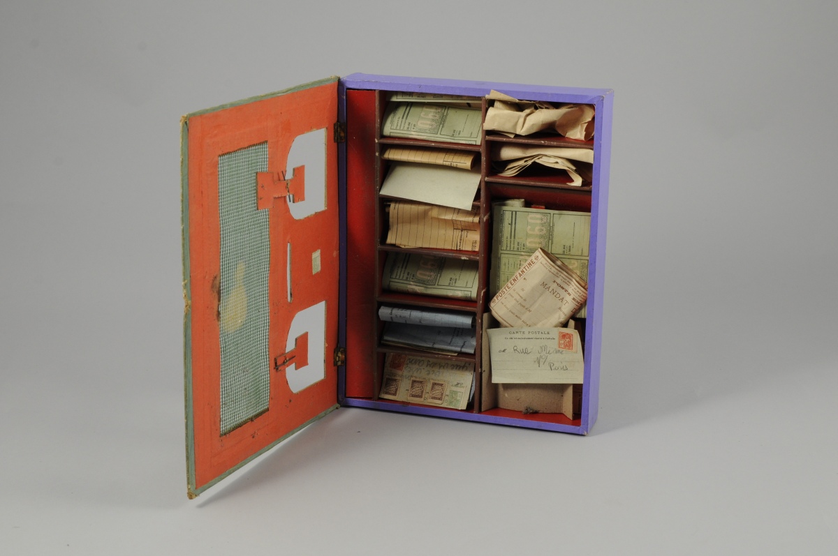 N.K FRANCE. POSTE ENFANTINE dans une boîte en pin et cartonnage, façade simulant un guichet de poste, petits casiers à l'intérieur avec ensemble d'environ 70 fausses cartes postales, timbres, mandats et autres documents postaux. Début XXème. Haut. 23, Larg. 28, Prof. 5 cm. (usures d'usages)