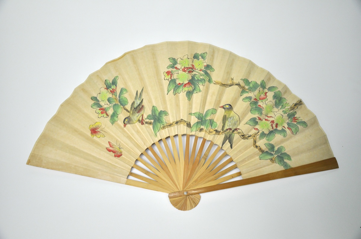 EVENTAIL. Aquarelle sur papier représentant des oiseaux perchés sur branche d'arbres fleuris, armatures en bambous. 2 crochets cousus au dos pour accroche murale éventuelle.