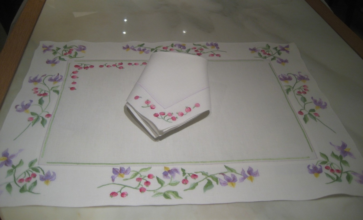 Maison PORTHAULT. Six sets de table modèle " Baies prestige " Brodés main sur lin blanc avec serviettes assorties.