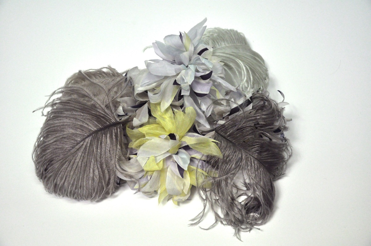 Broche en soie et plumes d'autruche, camaïeu de gris, bleus.