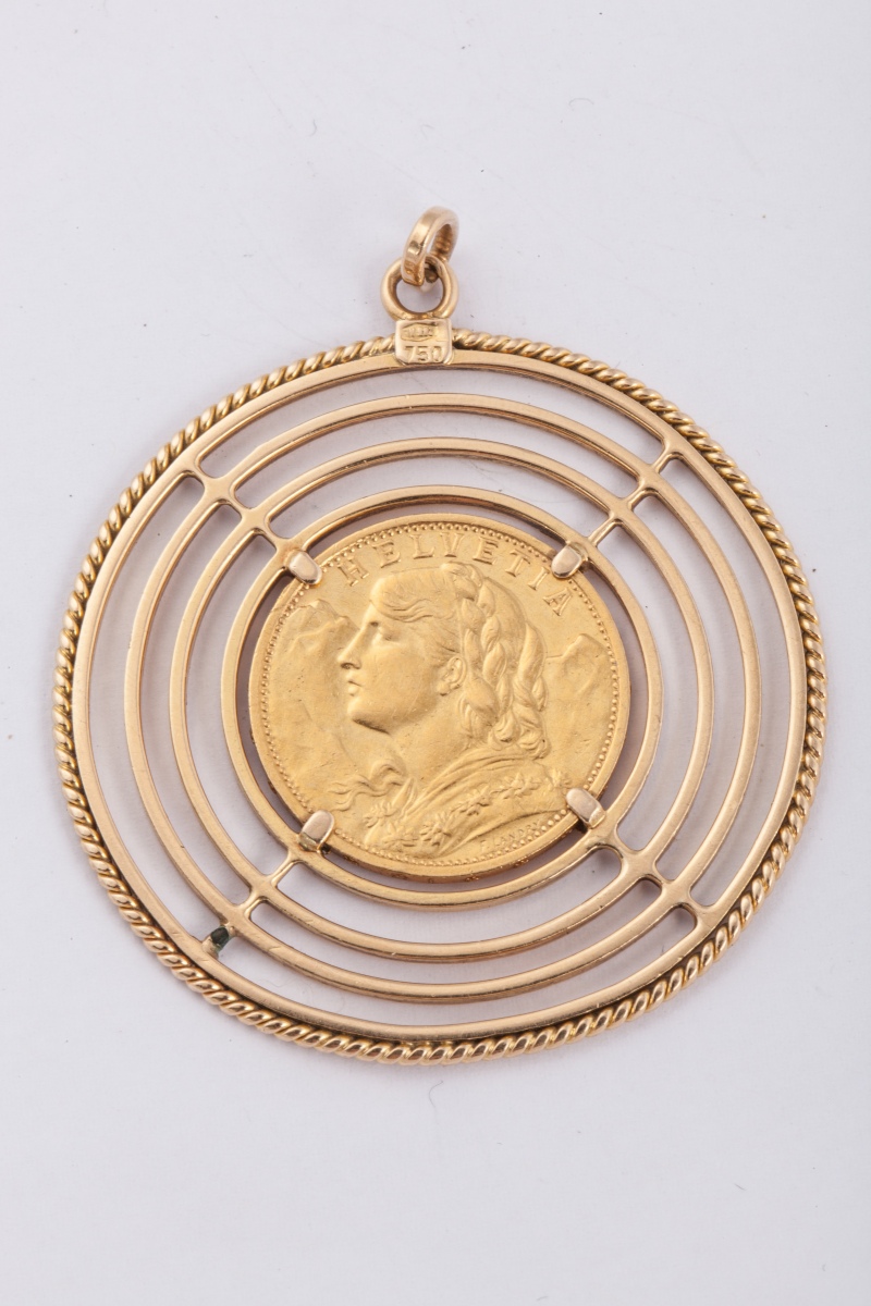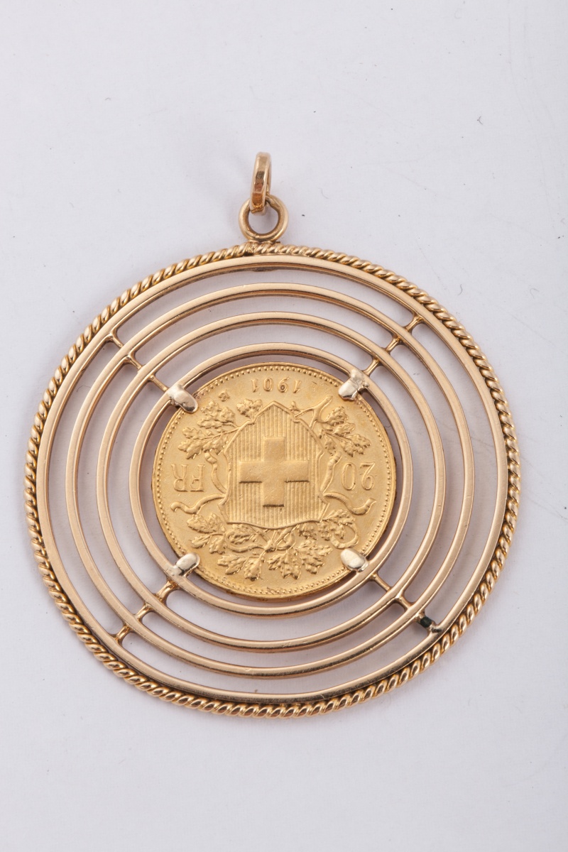 MÉDAILLON en or jaune composé de quatre cercles cylindriques entourant une pièce de 20 Francs or, Suisse, 1901. 42 mm. Poids16,5 g.