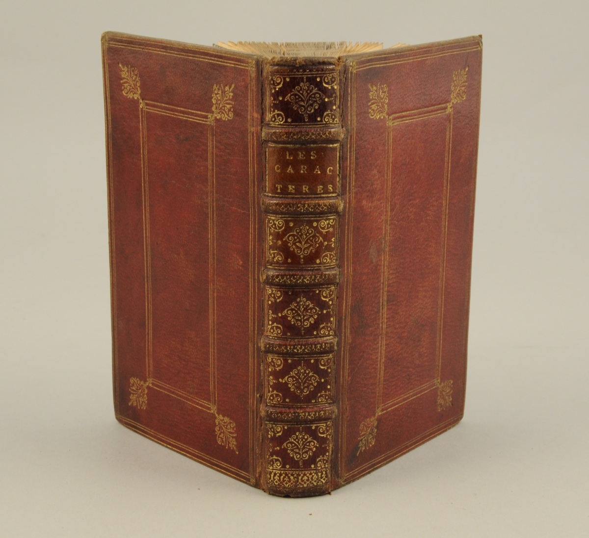 Plein maroquin cerise, décor à la Du Seuil, dos très orné, roulette sur les coupes, roulette intérieure. Toutes tranches dorées. (Mouillures saines dans les marges inférieures d'une vingtaine de feuillets ; quelques rousseurs).