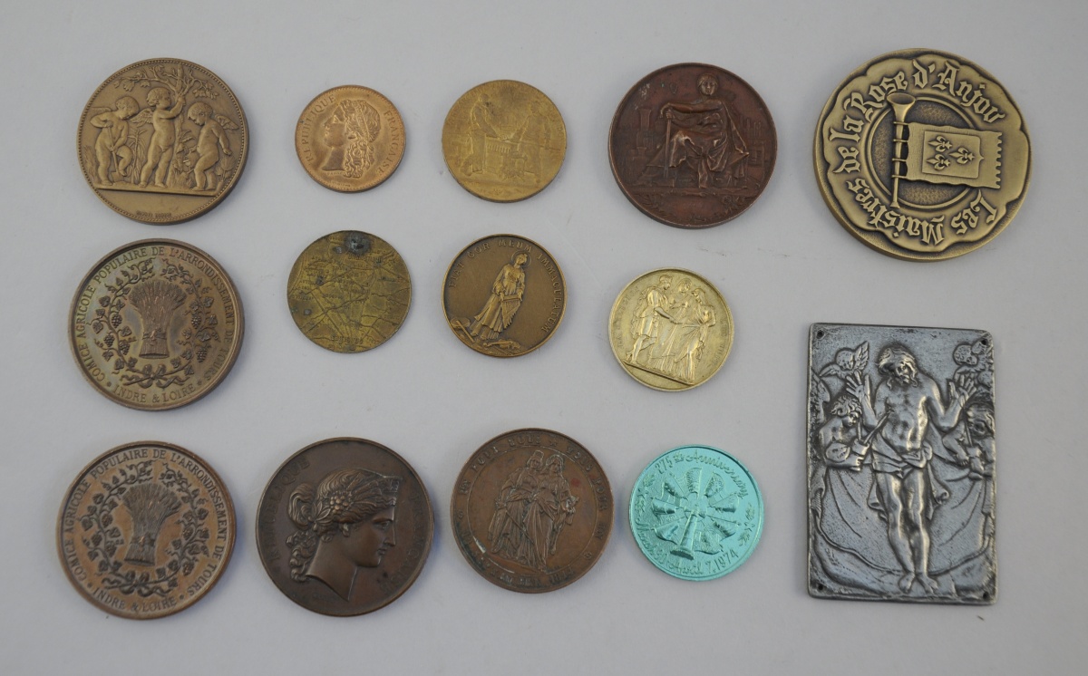 [MISCELANÉE DE MÉDAILLES ET MONNAIES]. 14 médailles et monnaies commémorant divers événements, dont comices agricoles, batailles, réunions, mariages et anniversaires, Bronze, bronze argenté et étain.
