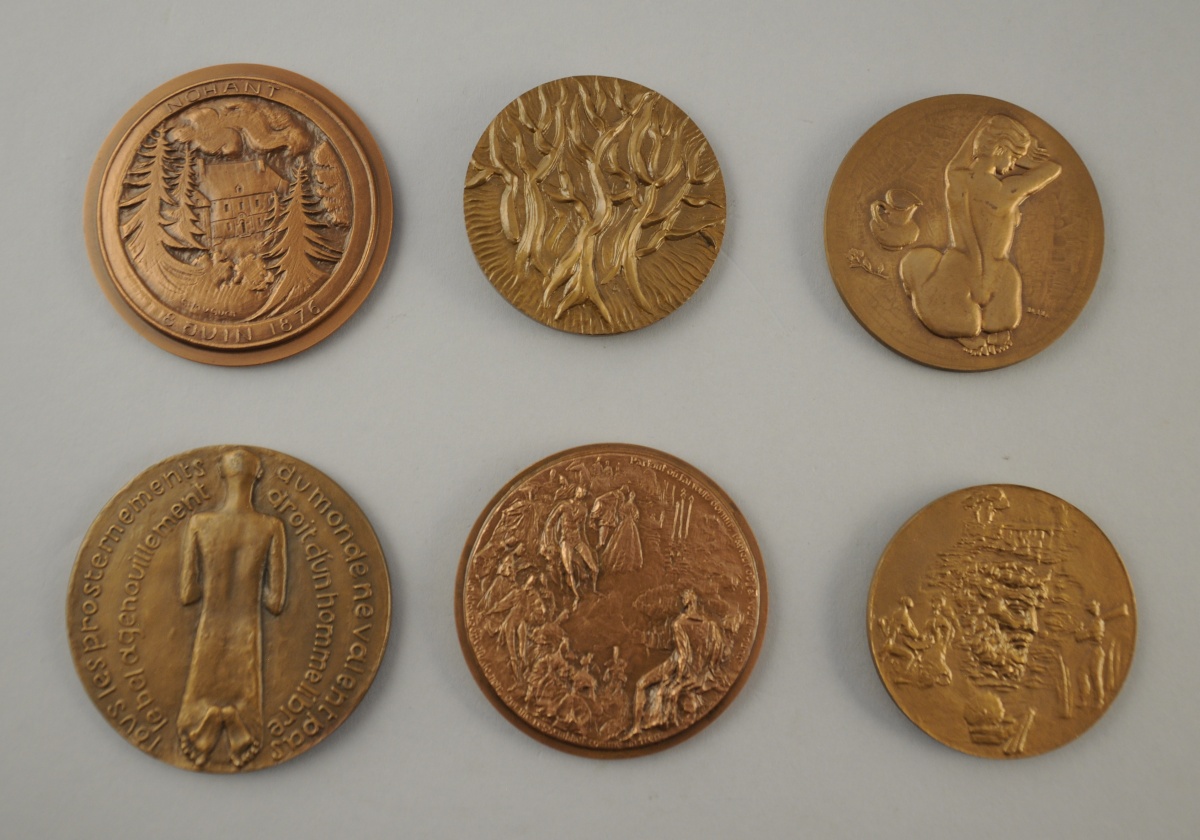 [LITTÉRATURE FRANÇAISE XIXe]. 6 médailles commémoratives : "George Sand" par Beco; "George Sand", par Muguet; "Guy de Maupassant", par Querolle; "Alfred de Musset", par Mocquot; "Charles Péguy", par Guastalla et "Paul Verlaine", par Flourat.