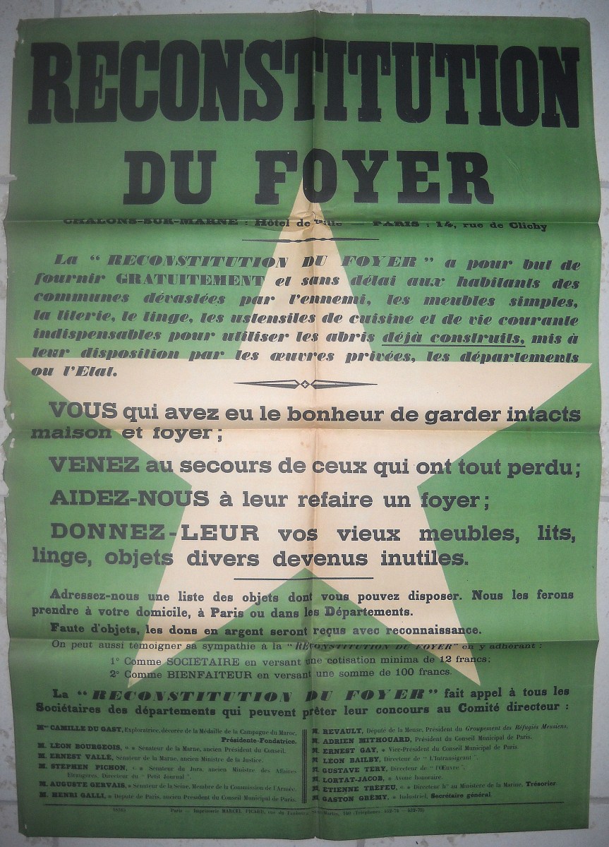 3 affiches à texte : " Reconstitution du foyer " [1915], Imprimerie Marcel Picard à Paris, 123 x 85 cm, traces de plis et manques, état moyen à B.E. - 2 affiches à texte : " Journée du 75, dimanche 7 février 1915, l'uvre du soldat au front ", imp. L. Pochy Paris, 76 x 55 cm - 2 affiches : " Journée des éprouvés de la guerre, le 26 septembre 1915 ", Aff. Camis Paris, 160,5 x 120 cm, traces de plis, déchirures et manque au coin gauche pour l'une, état moyen ; 119 x 79 cm, traces de plis, petits défauts en marge, B.E. - "12 septembre 1915, journée de l'uvre nivernaise des mutilés de la guerre " par Maurice Neumont, Devambez imp. Paris, 119 x 80 cm, traces de plis, T.B.E. - 2 affiches à texte : " Journée française du secours national