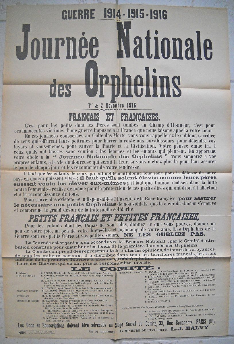 3 affiches : " Guerre 14-15-16, journée nationale des orphelins " par Charles Foerster, 119 x 80 cm, traces de plis, B.E. - 3 affiches à texte : " Guerre 1914-1915-1916, journée nationale des orphelins, 1er et 2 novembre 1916 ", 80 x 60 cm (2) et 119 x 80 cm, traces de plis, T.B.E. - 2 affiches : " Journée nationale des orphelins, guerre 1914-15-16 " par Bernard Naudin, 119 x 80 cm, traces de plis, T.B.E. - " Journée de l'orphelinat des armées, 20 juin 1915 " par Alfred Philippe ROLL, imp. Pichot Paris, 119 x 161 cm, traces de plis, T.B.E. - " Office national des pupilles de la nation, 14 juillet 1918 " par Adolphe WILLETTE, Devambez Paris, 113 x 79 cm, traces de plis et petits défauts en marge, B.E.