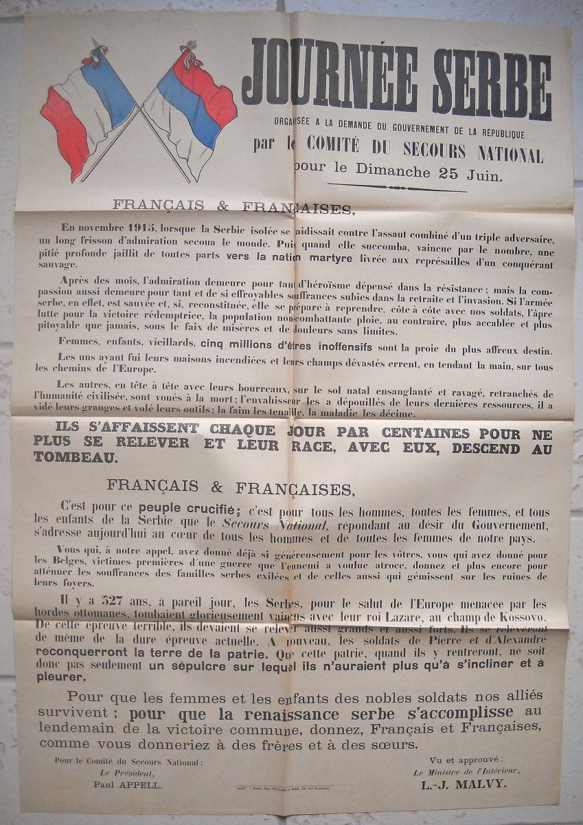 2 affiches : " La journée serbe, 23 juin 1916, anniversaire de la bataille de Kossovo " par Charles Fouqueray, Devambez imp. Paris, 114 x 80 cm, traces de plis, T.B.E. - " 25 juin 1916, journée serbe " par Théophile Alexandre Steinlen, Lapina imp. Paris, 118 x 81 cm, traces de plis et petits défauts, B.E. - Affiche à texte : " Journée serbe organisée à la demande du gouvernement de la république par le comité du secours national pour le dimanche 25 juin