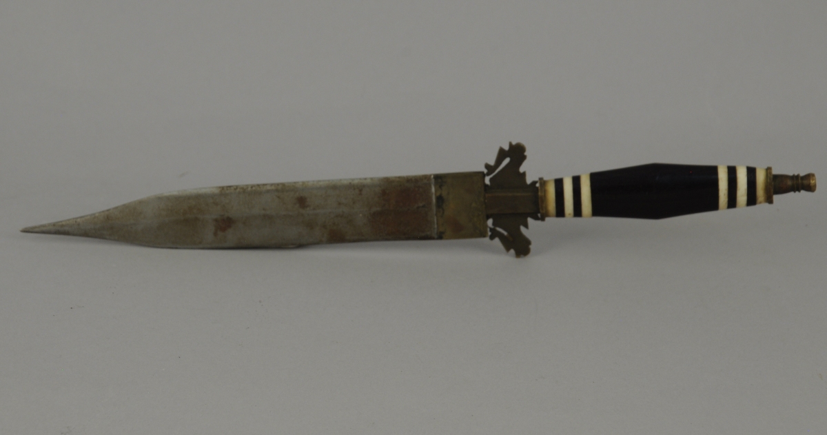 AFRIQUE DU NORD. POIGNARD, lame à double tranchant et arrête médiane. Quillon découpé en laiton, manche en ébène et os, pommeau tourné. XXe. Long. 27 cm.