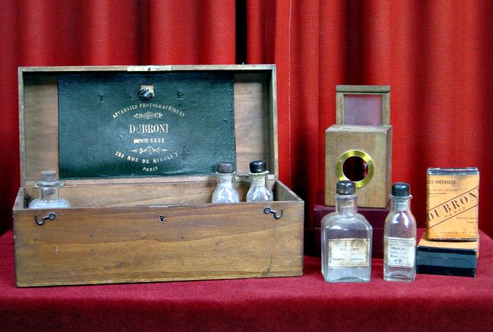- 2 boîtes (vides) dont une avec étiquette marquée "2 plaques préparées au Gélatino-Bromure d'argent, 6 x 9 et Dubroni Paris" ; l'autre boîte légèrement plus grande avec marque et 6 x 9 (pouvait contenir le papier).
