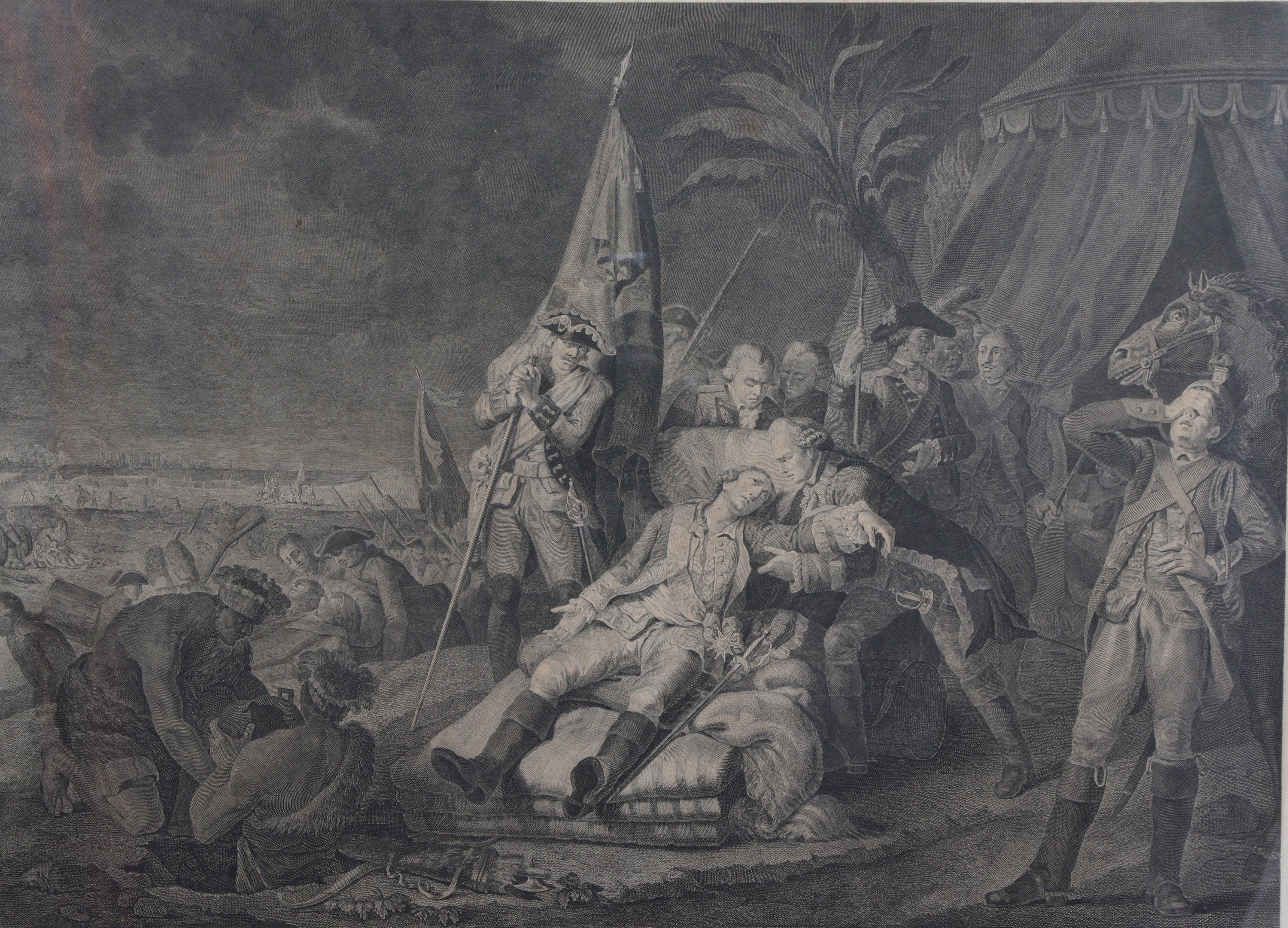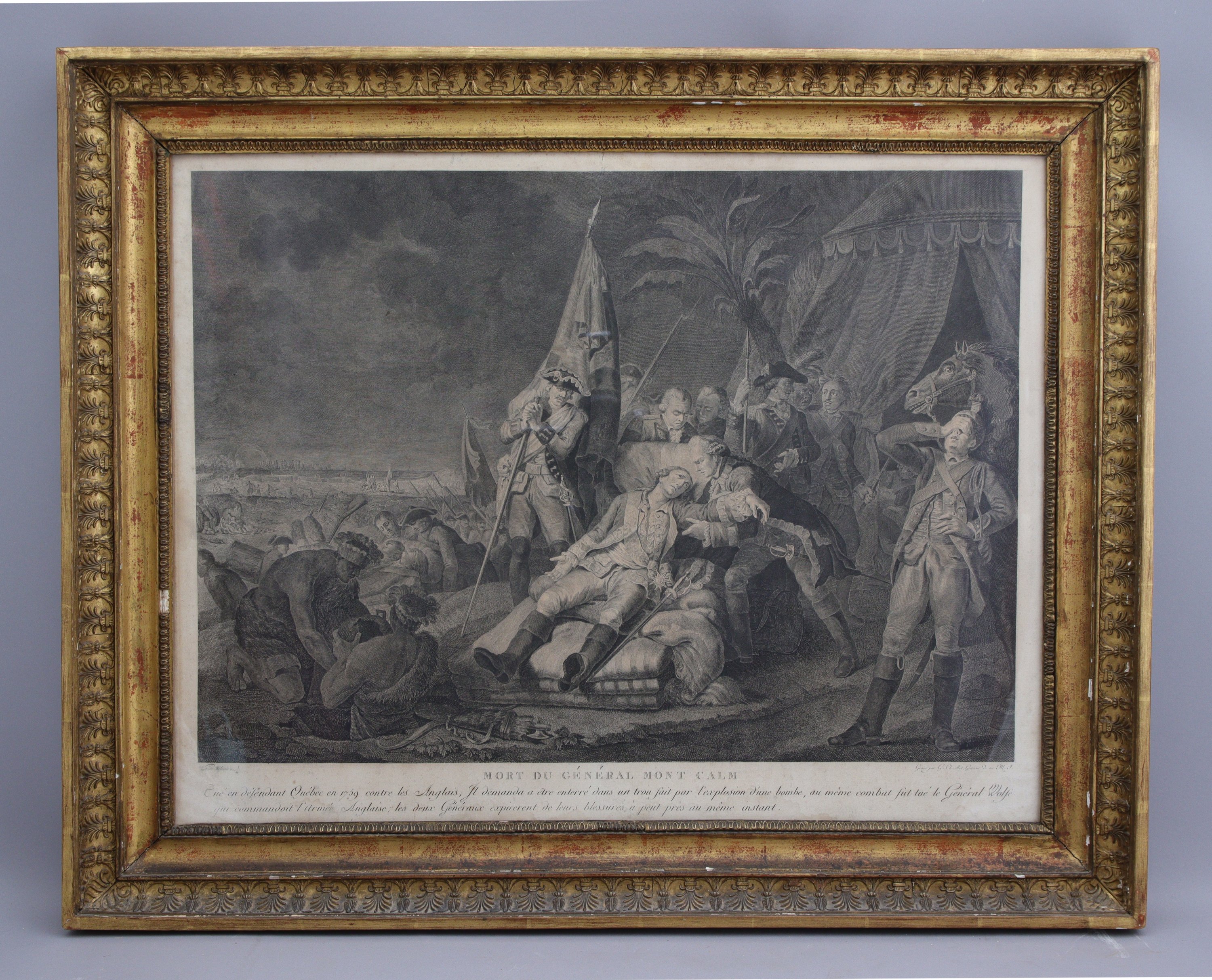 - Justus Chevillet (1729-1790) d'après François-Louis-Joseph Watteau (1758-1823), "La mort du général Mont Calm". Eau-forte. Titrée et légendée : "Tué en défendant Québec par les Anglais, il demanda à être enterré dans un trou fait par l'explosion d'une bombe, au même combat fut tué le général Wolfe qui commandoit l'Armée Anglaise, les deux Généraux expirent de leurs blessures à peu près au même instant". L'image : Haut. 42,5 Larg. 59,5 cm.
