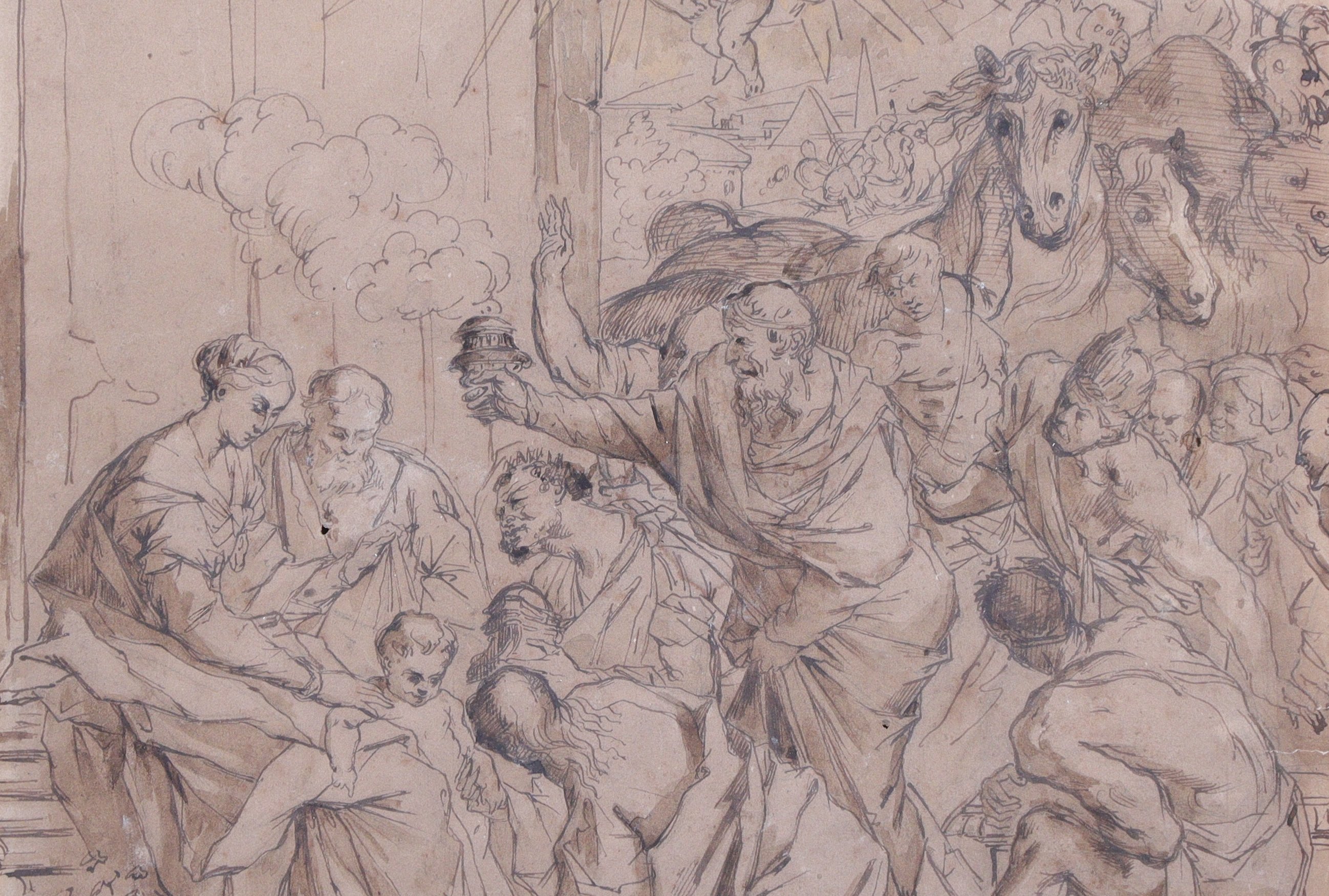 Plume et encre brune, lavis brun sur traits de crayon noir et rehauts d’aquarelle dans le haut.