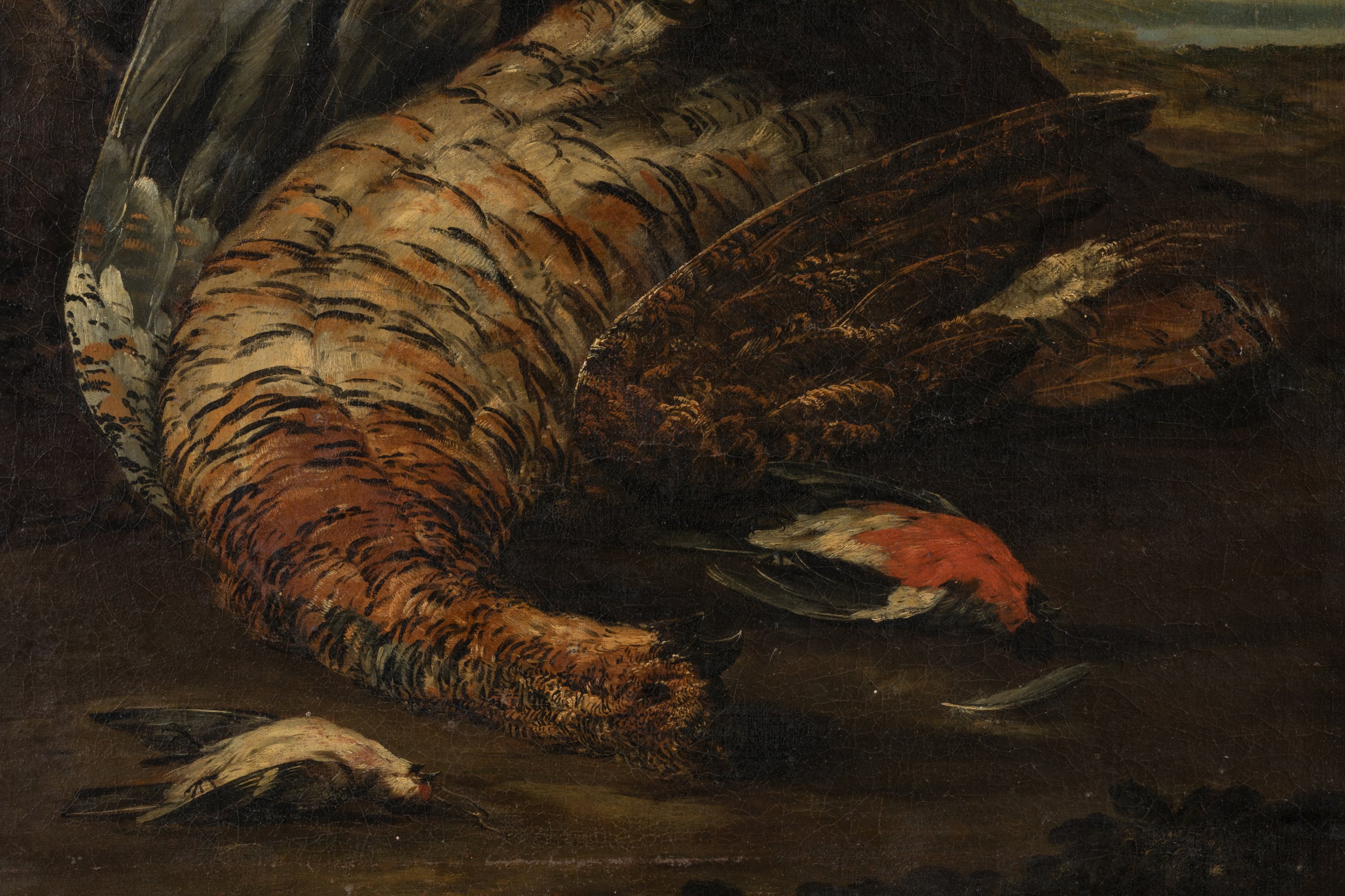 Attributed to Baldassarre de Caro. A pair of still life paintings depicting a bustard and a jay for one and a mallard for the other. In gilded wood and stucco frames.