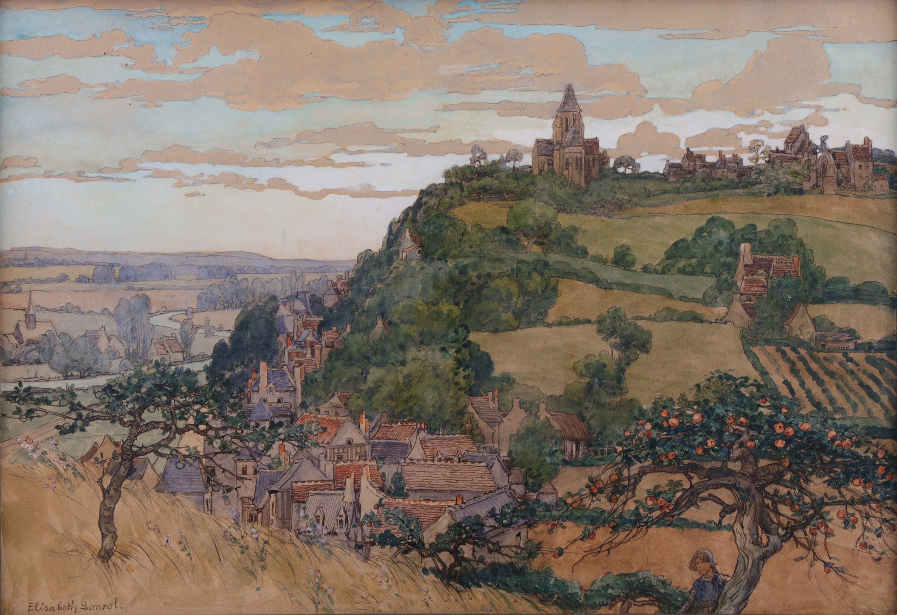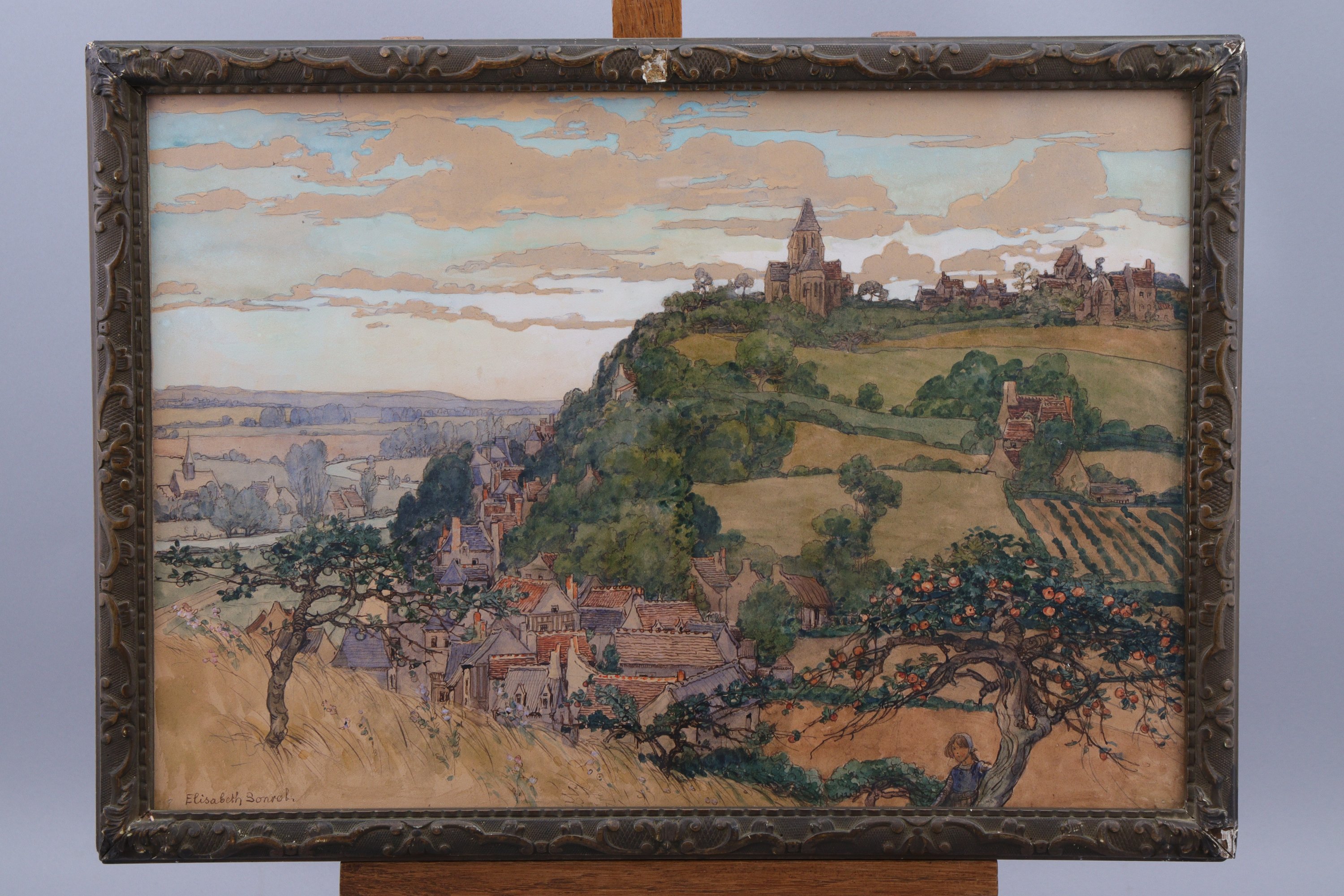 Née à Tours, Elisabeth Sonrel se forme dans l'atelier de Jules Lefebvre (1836-1911) en plus des cours qu'elle suit à l'Académie Julian. Elle continue toutefois d'entretenir des relations privilégiées avec sa région natale. Elle figure ainsi parmi les vedettes des expositions de la Société des amis des arts de Tours tout en proposant des illustrations pour la revue "La Touraine", organe public des Sociétés tourangelles artistiques, littéraires et scientifiques qui n'ont pas une revue en propre. Cette vue de Trôo s'inscrit pleinement dans l'oeuvre de l'artiste, usant de l'aquarelle dans des encadrements de traits d'encre.