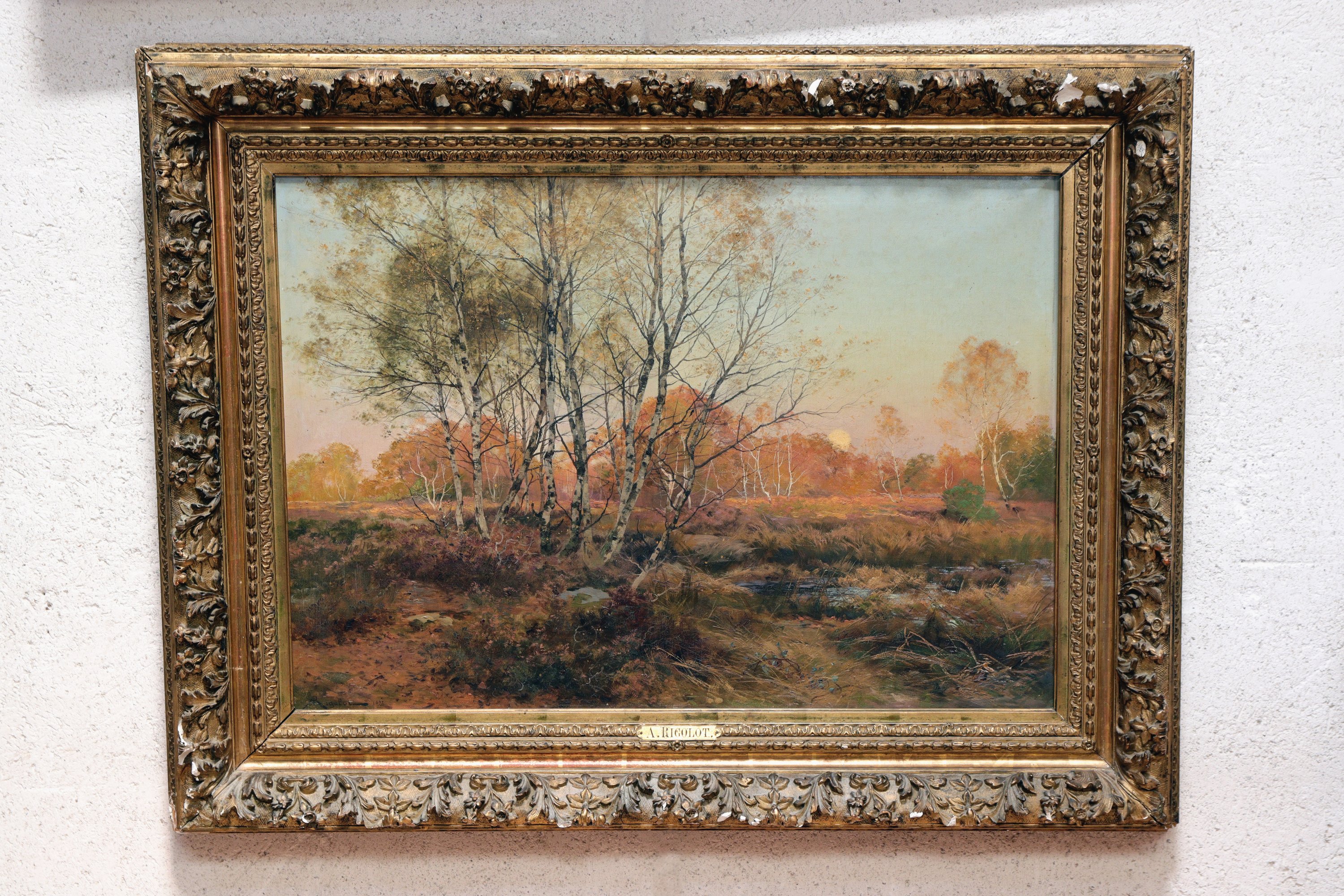 Influencé par l'Ecole de Barbizon, Albert-Gabriel Rigolot s'efforce de retranscrire avec soin les paysages en général et ceux d'automne en particulier. Cette saison est effectivement l'occasion pour le peintre de jouer des couleurs rousses. Outre notre toile, probablement présentée à l'exposition de Mulhouse en 1893, l'artiste expose au Salon des artistes français en 1911 un "Automne dans les marais de la Somme", après une "Matinée de septembre dans la vallée de Chevreuse" en 1890.