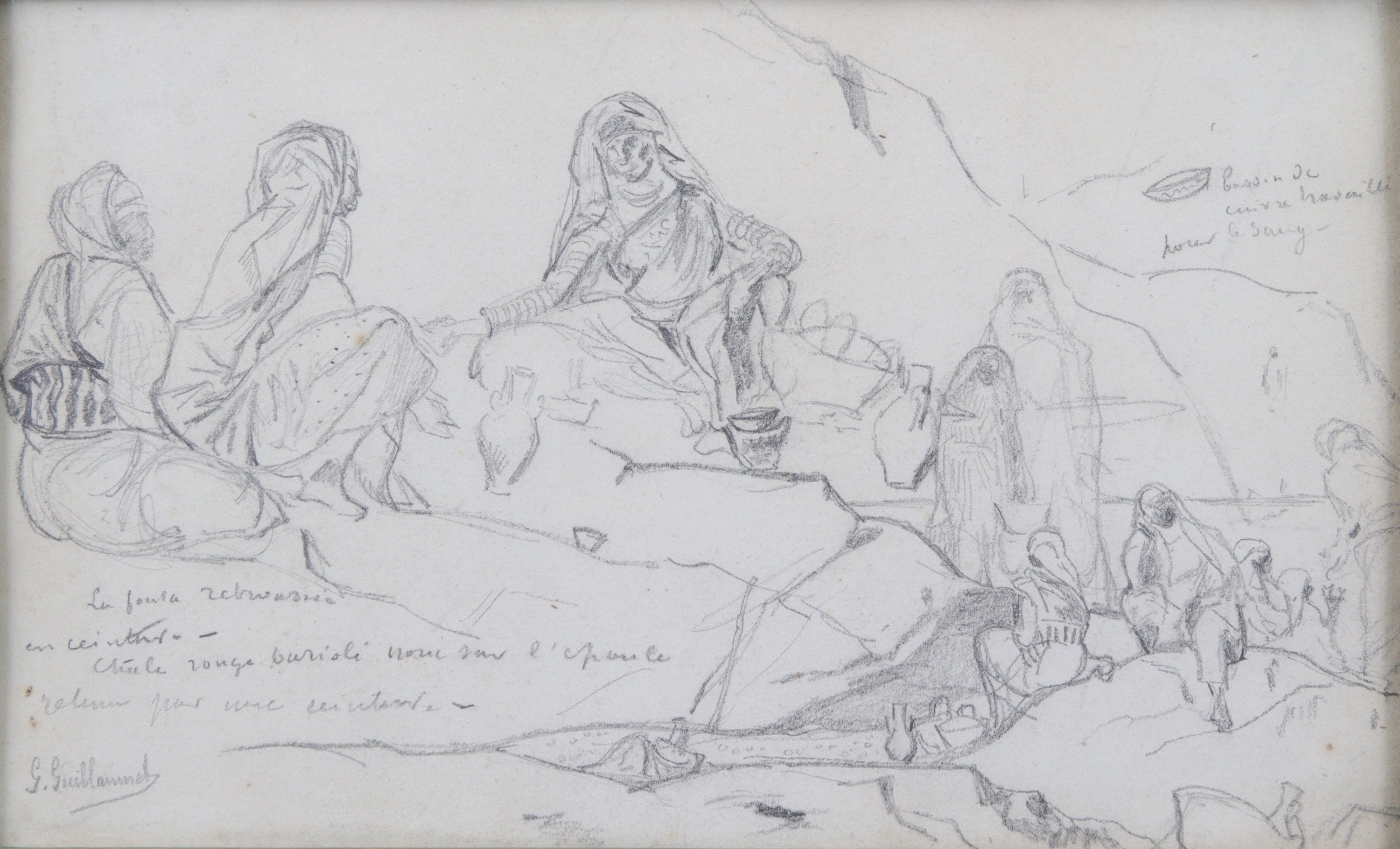 Signé en bas à gauche avec annotations "La fouta retroussée / en ceinture / châle rouge bariolé noué sur l'épaule / retenu par une ceinture" et "bassin de / cuivre travaillé / pour le sang".