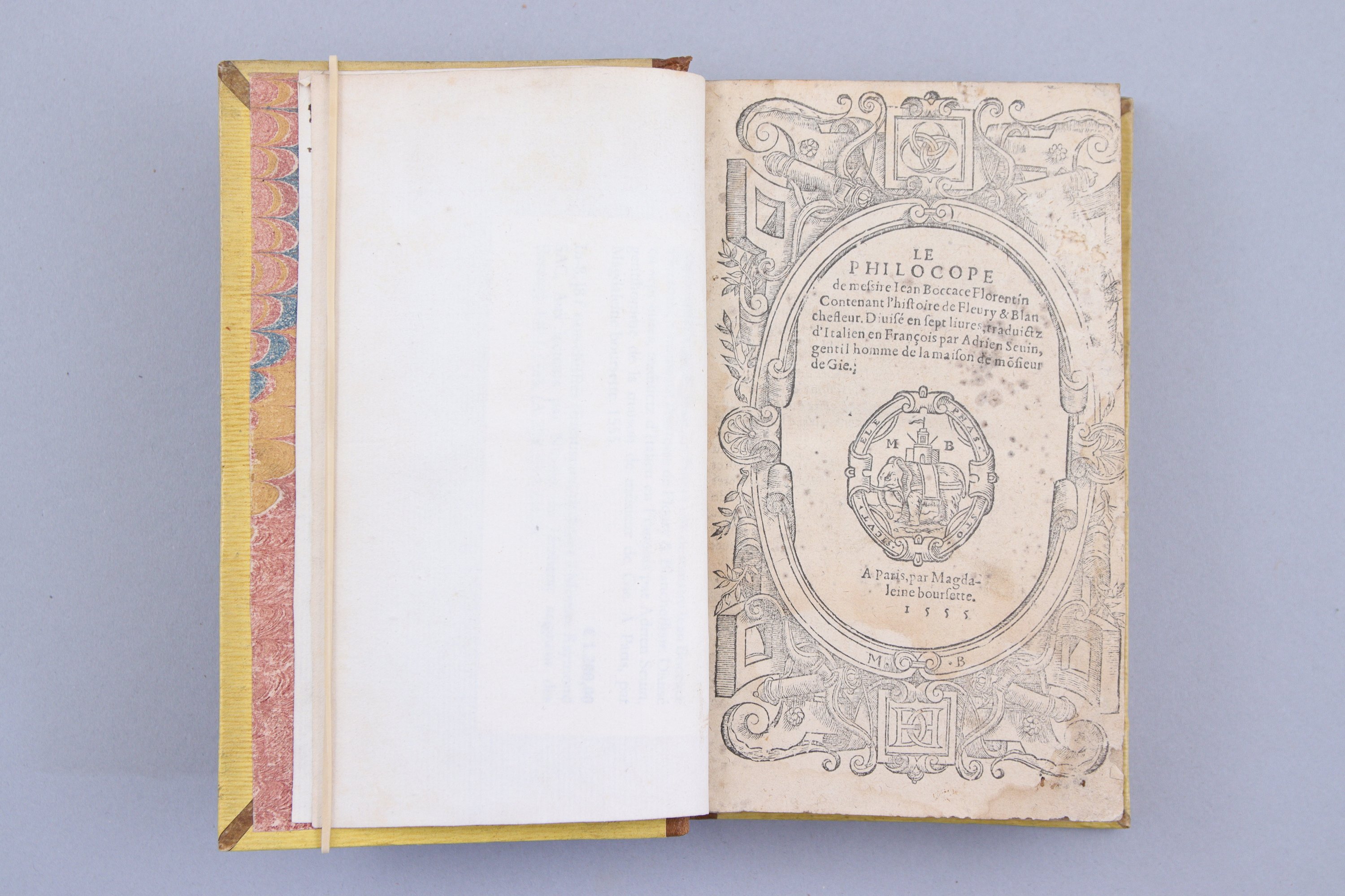 Deuxième édition de la traduction du Philocope par Sevin, après celle, in-folio, de 1542. Elle est précédée d'une Epitre de Sevin à la Comtesse de Saint Aignan, Claude de Rohan.