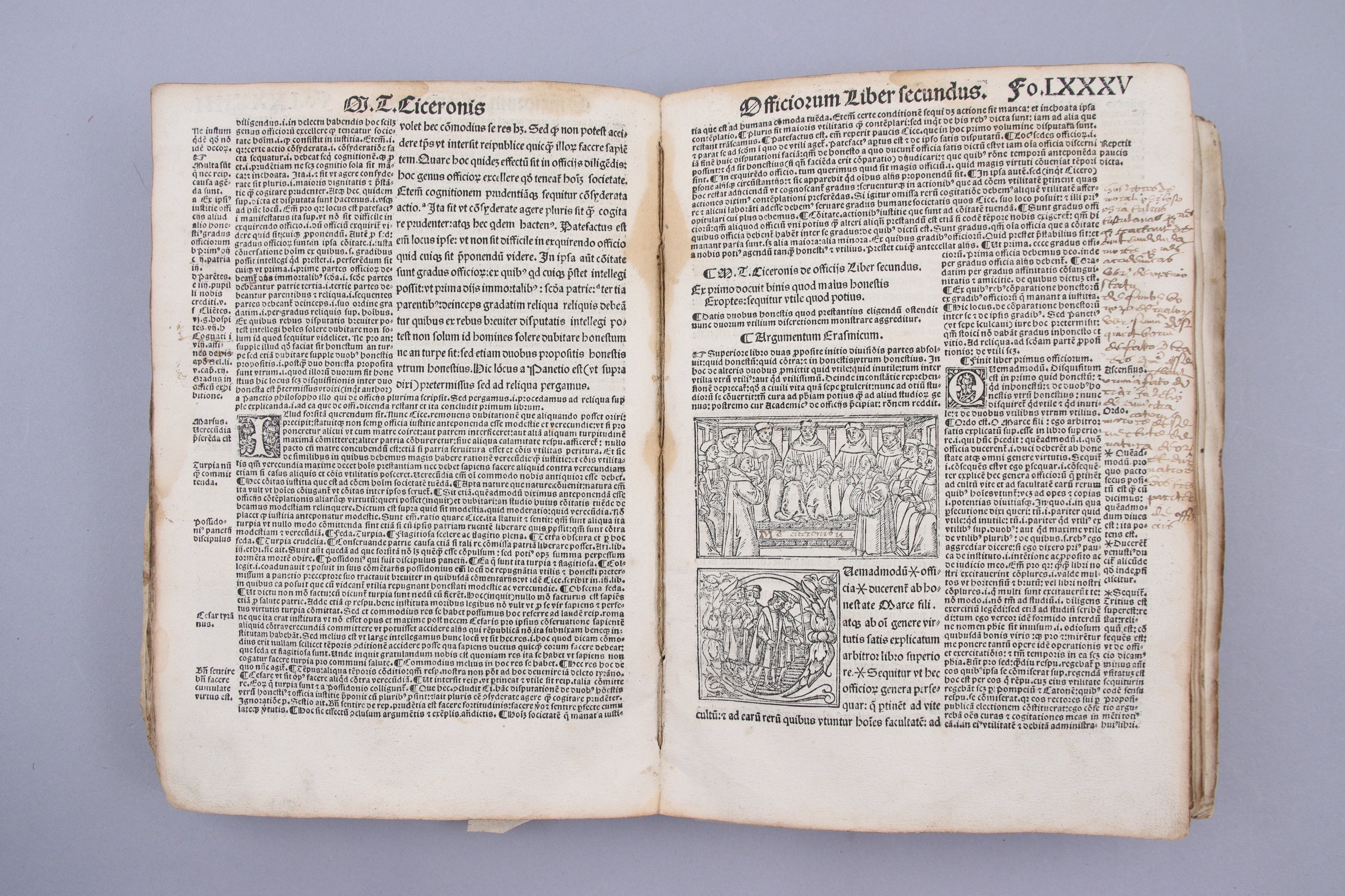 Rare impression de Simon Vincent en caractères gothiques. Titre avec portique en rouge et noir ; lettrines ; 5 bois gravés. Notes et remarques d'Erasme, sur un texte établi en particulier par Josse Bade .Achevé d'imprimer le 27 janvier 1523.