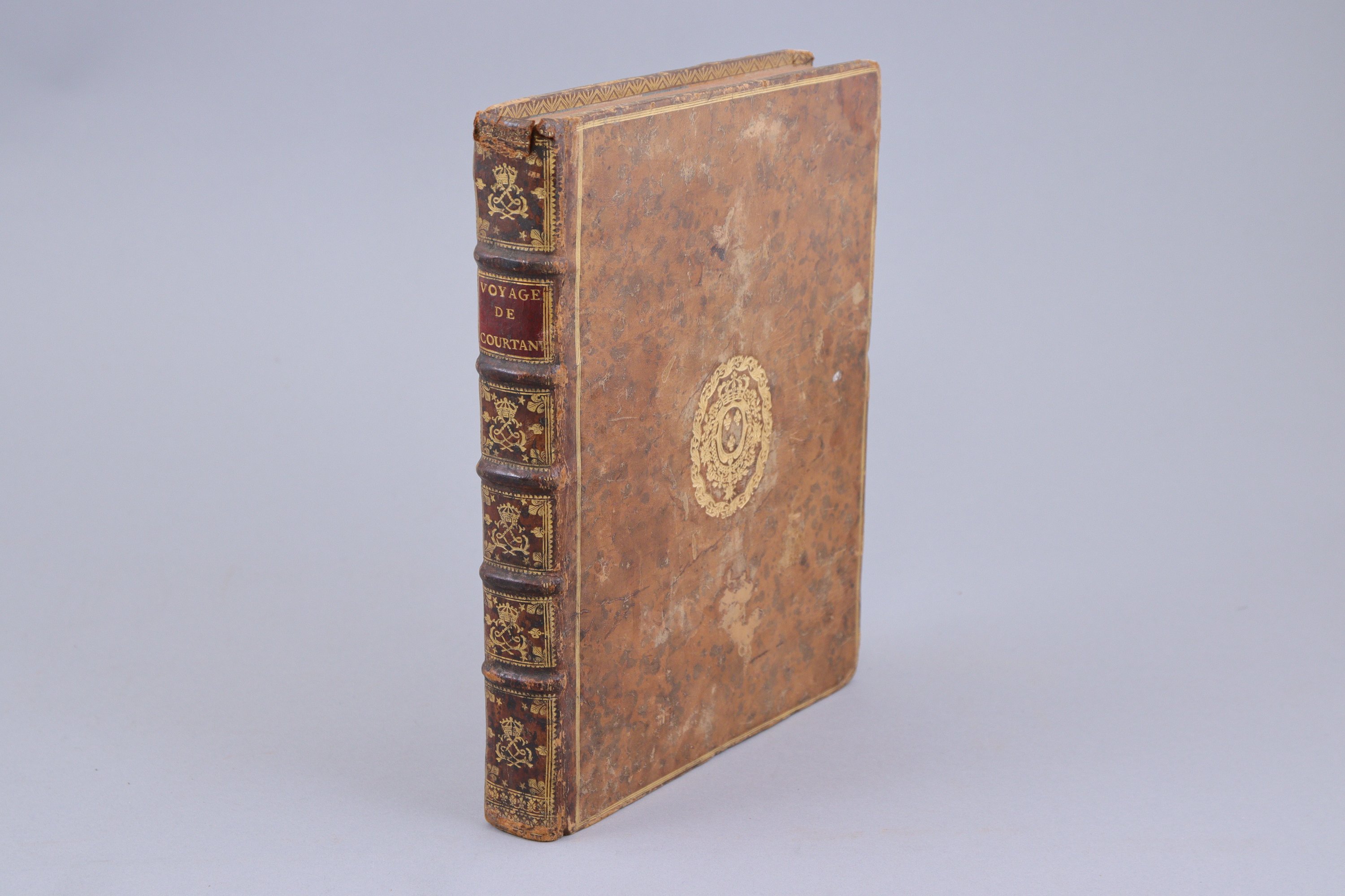 In-4°, frontispice d'après un dessin de Ozanne, titre, VIII pages, 316 pages, 1 carte et 4 planches dépliantes, (3 pp) pour l'avis au relieur et les errata. Plein veau fauve, triple filet d'encadrement, armes royales au centre des plats, dos orné dans les caissons d'un chiffre couronné, roulette sur les coupes. (Coiffe supérieure endommagée ; coupes et coins frottés)..