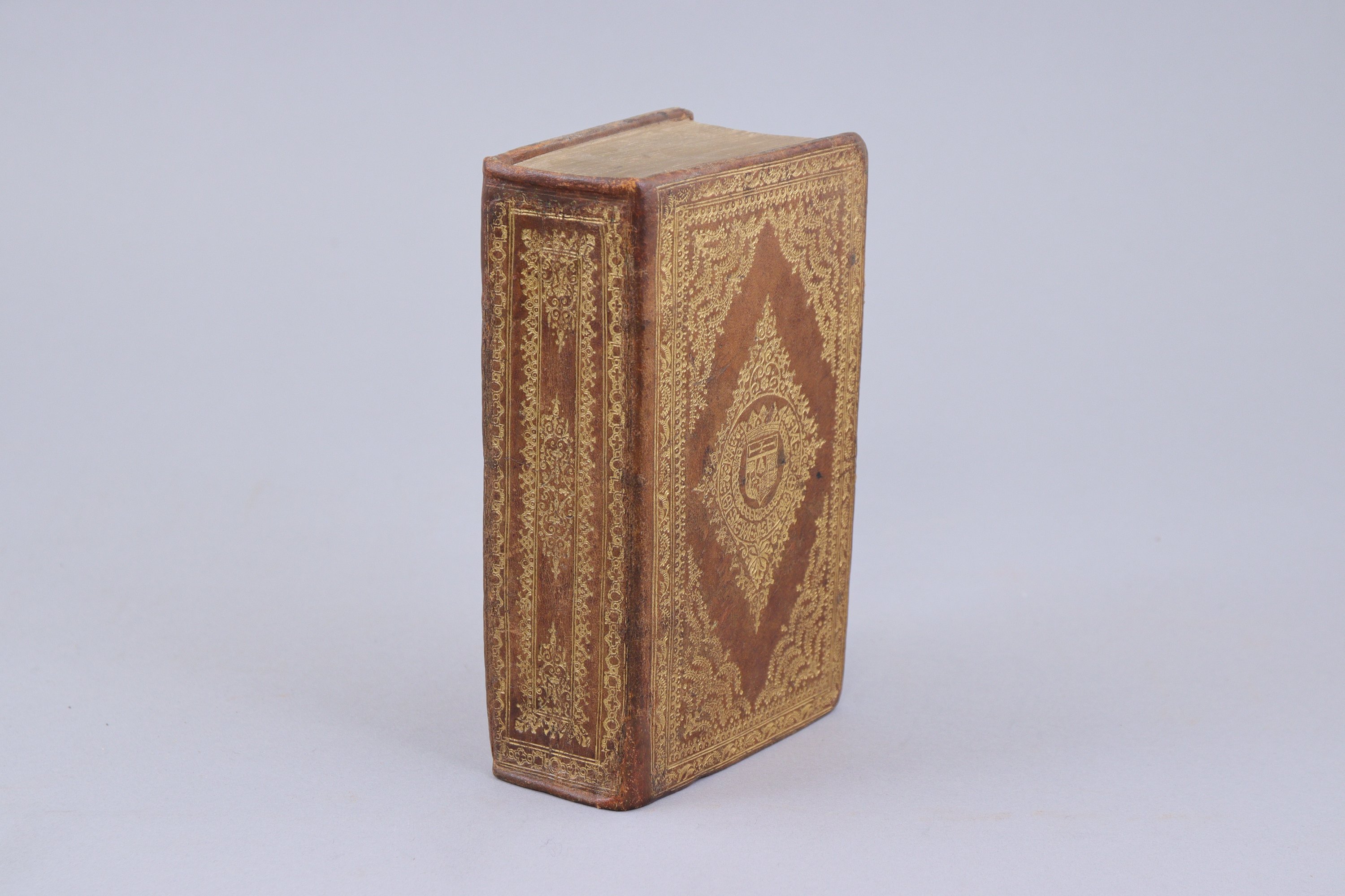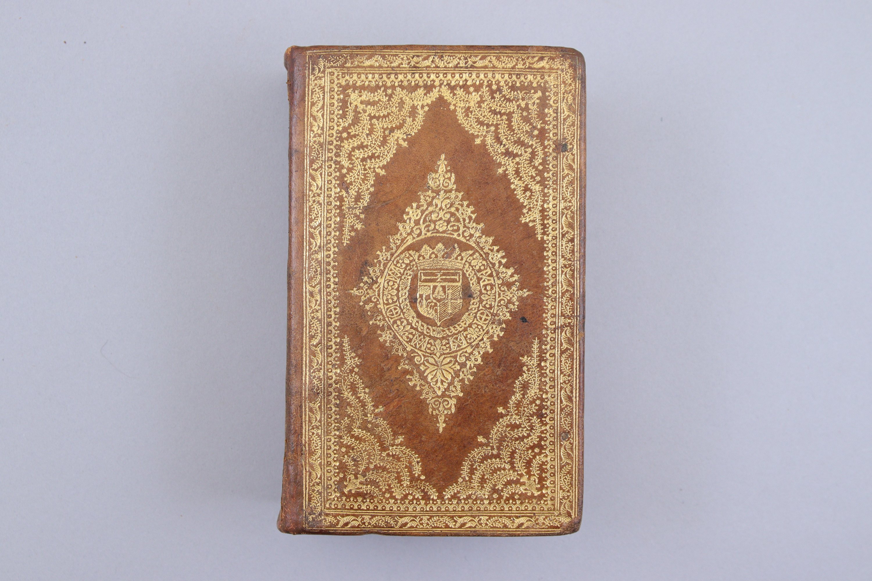 Plein maroquin fauve. Bordure de petits fers "au rameau d'olivier" inscrite entre deux encadrements de filets doubles et une finr roulette . Large décor composé dans chaque angle d'une vasque d'où sort une vingtaine de fers "au rameau d'olivier", de taille moyenne. Large décor losangé central aux petits fers, dans lequel sont inscrites les armes du Duc d'Epernon.