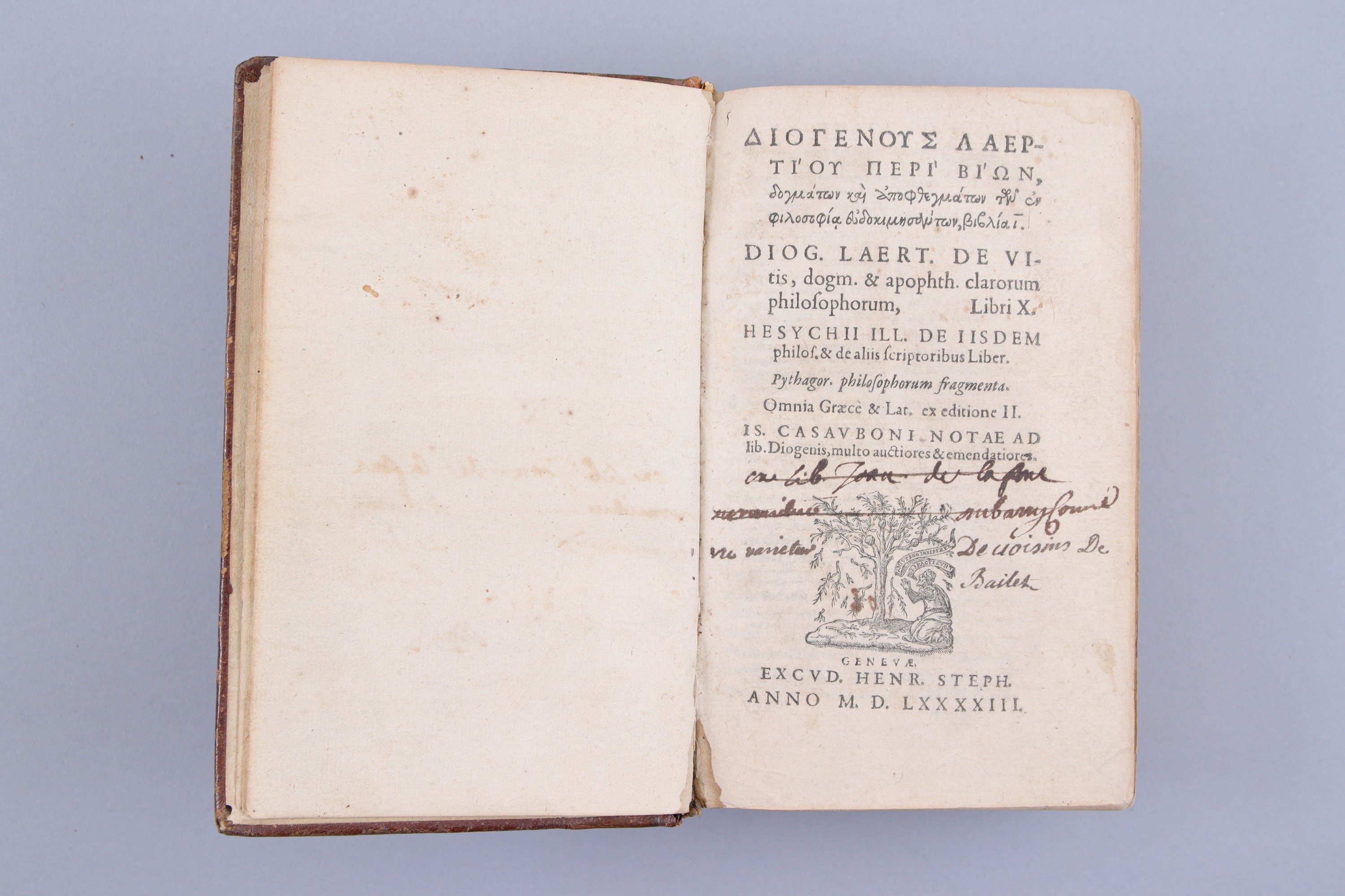 Edition bilingue, grecque avec les traductions latines. Troisième édition, complétée, donnée par Isaac Casaubon (1559-1614), gendre d'Henri Estienne II, élève du Crétois François Portus, et titulaire de la chaire de grec à l'Université de Genève.