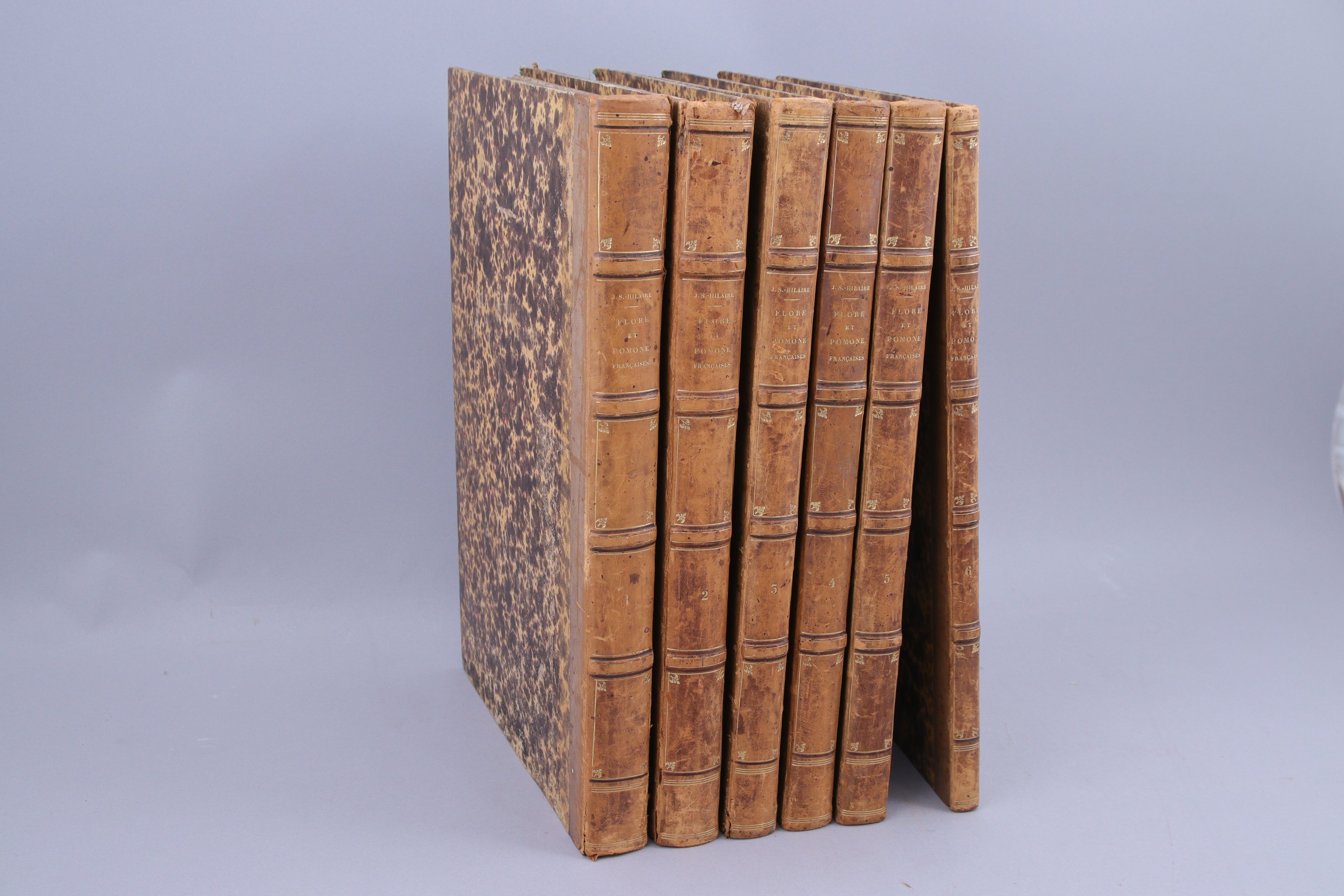 6 volumes in-4° réimposés in-folio (400 X 270 mm). 1/2 veau fauve du temps, dos ornés de fers très sobres, probables fers "de l'éditeur". (Quelques défauts aux coiffes et aux coins. Rousseurs marquées sur les feuillets de texte, rares sur les planches.