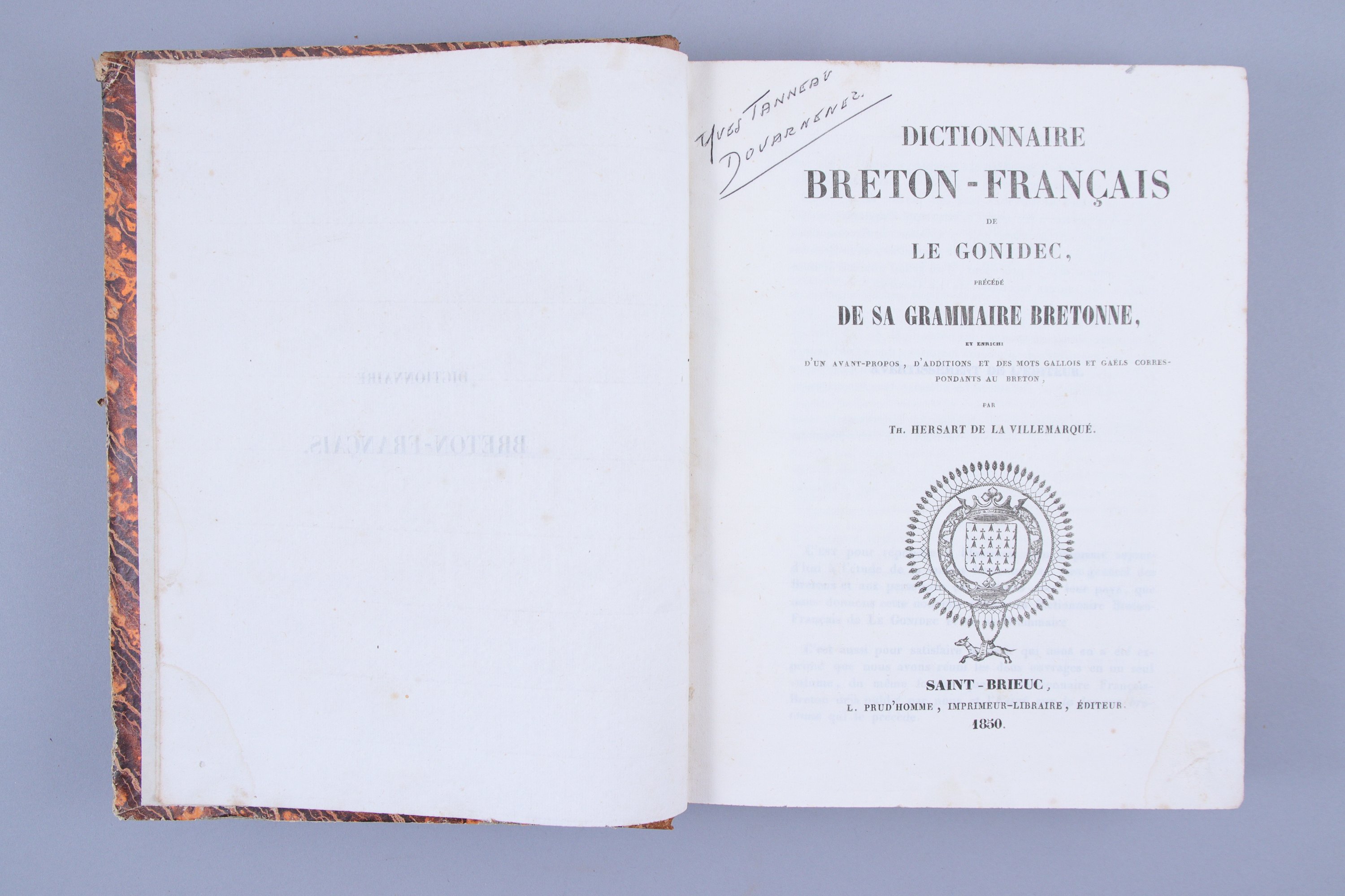 2 volumes in-4°. LXVIII pages et 834 pages, (1 f). XX pages et 594 pages. 1/2 basane du temps, dos sans nerf. (Reliures solides, mais un mors du dictionnaire Breton-français est fendu sur environ 10 cm. Les deux dos sont frottés.).