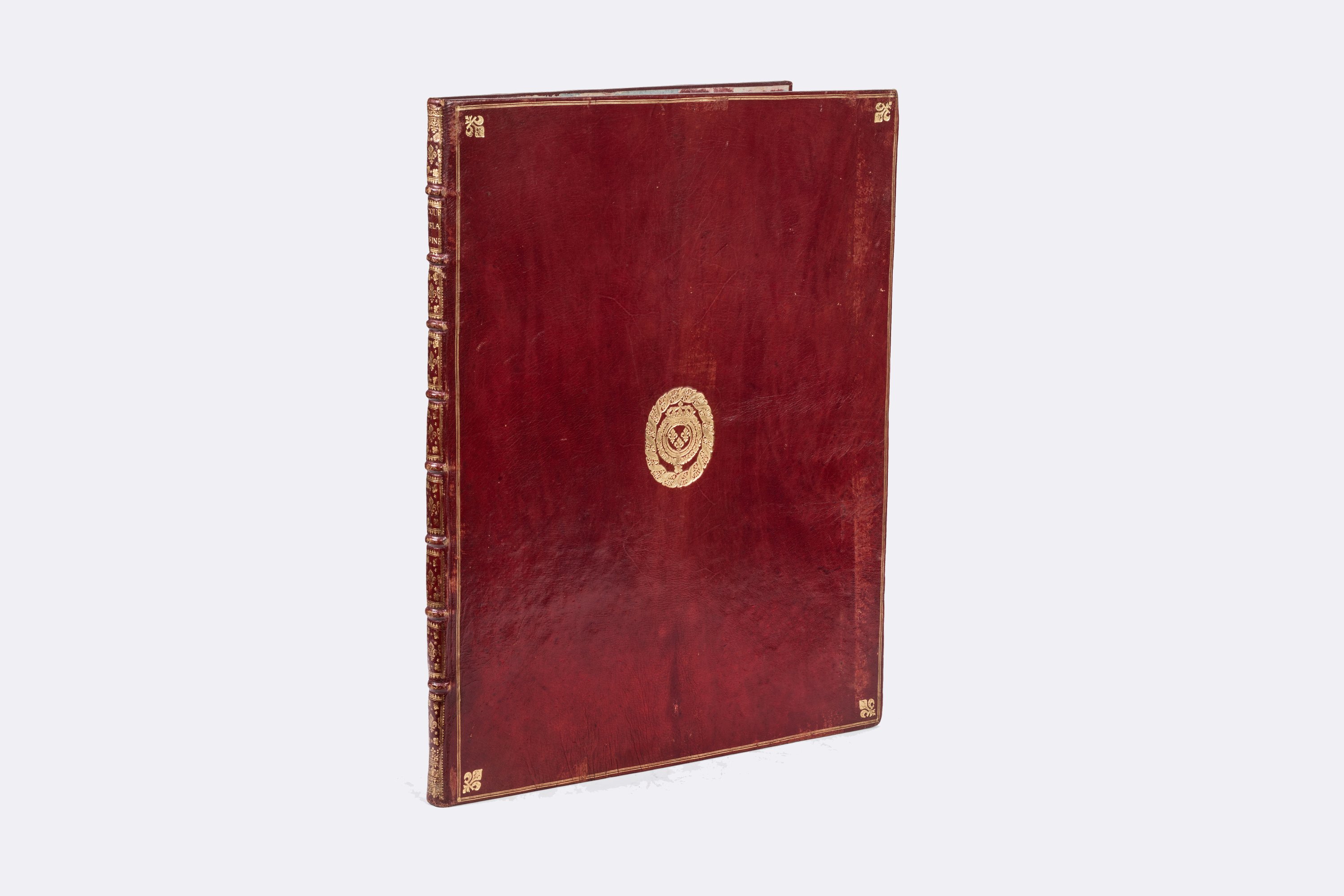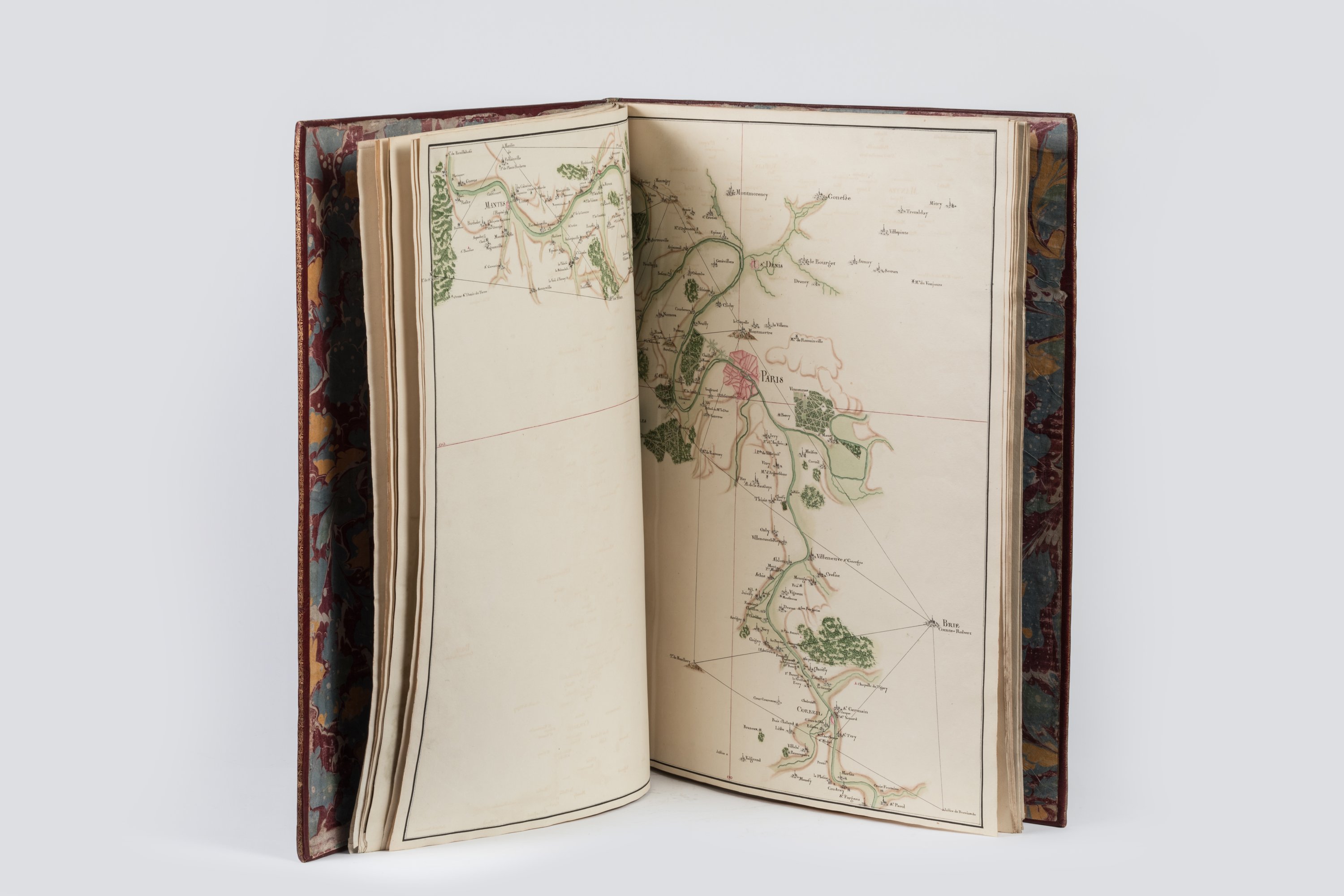 Grand-in folio(825 X 509 mm) renfermant 8 cartes dessinées à l'encre de Chine, lavis d'encre de Chine et aquarelle, montées sur onglet. Plein maroquin rouge. Triple filet droit d'encadrement, fleurs de lys dans les angles ; grandes armes royales sur les plats. Dos à 8 nerfs, fleurs de lys poussées dans les caissons. Large roulette sur les coupes.