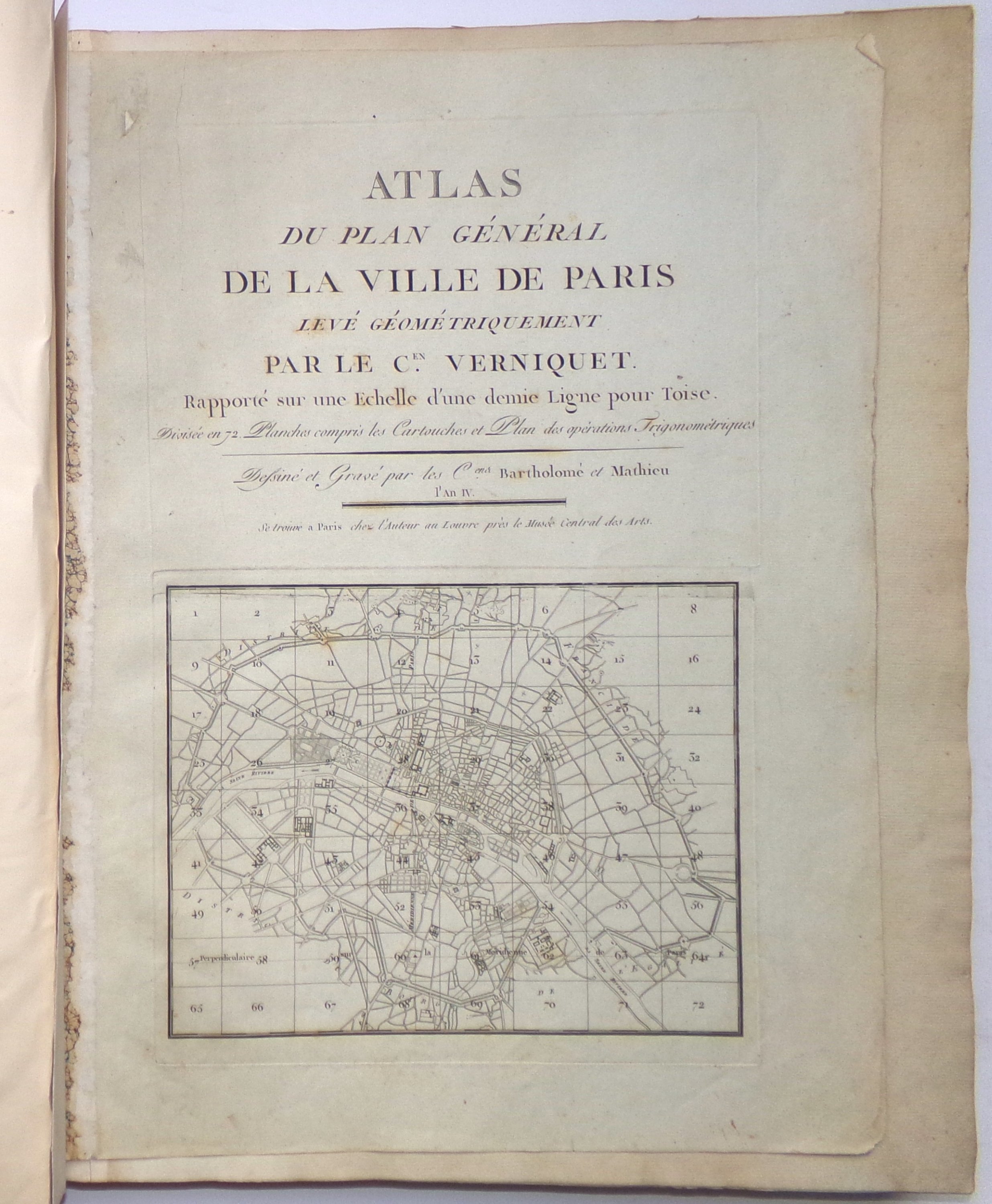 Atlas du Plan général de la ville de Paris levé géométriquement rapporté sur une échelle d'une demie ligne pour toise. Dessiné et gravé par les C[itoy]ens Bartholomé et Mathieu. A Paris, chez l'auteur, An IV. Grand in-folio rel. ½ basane.