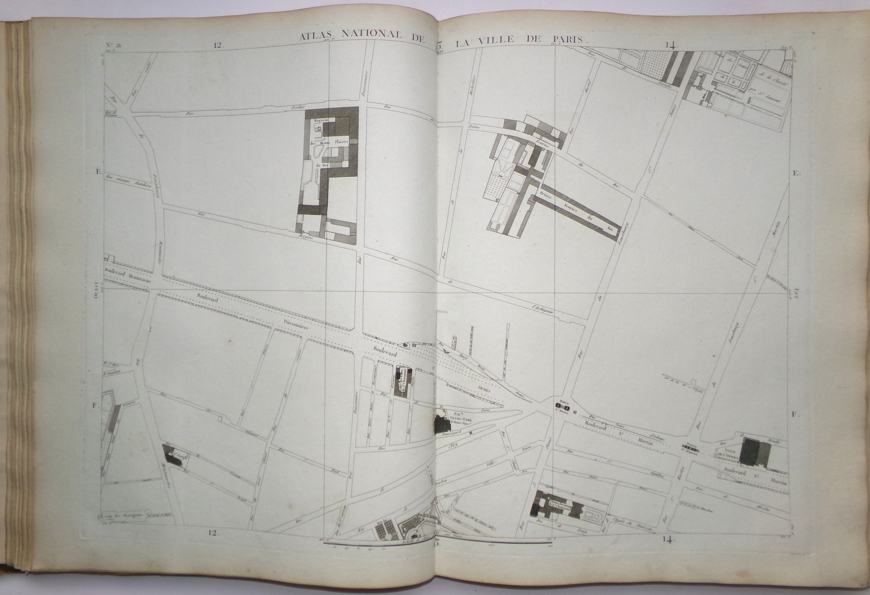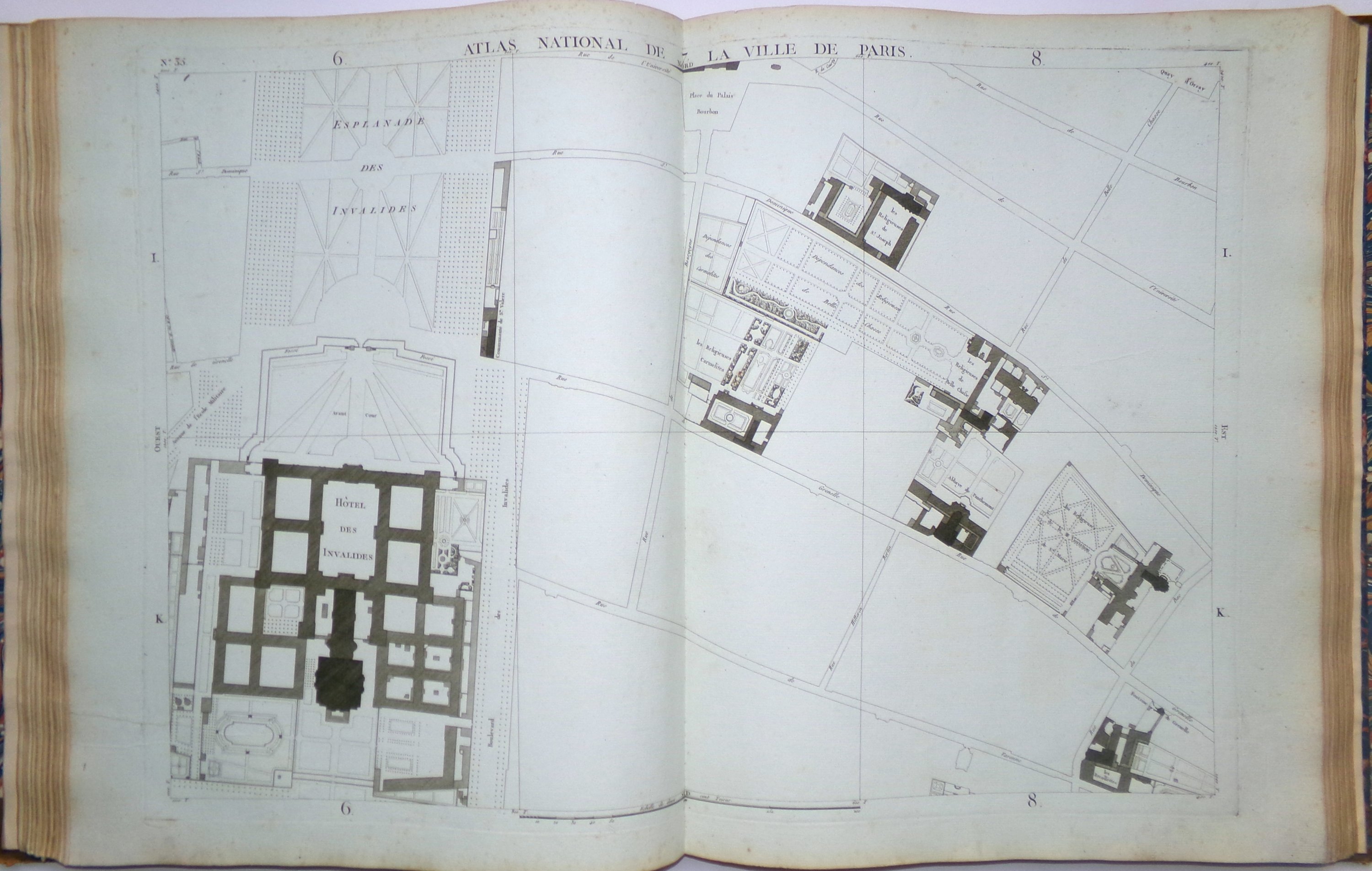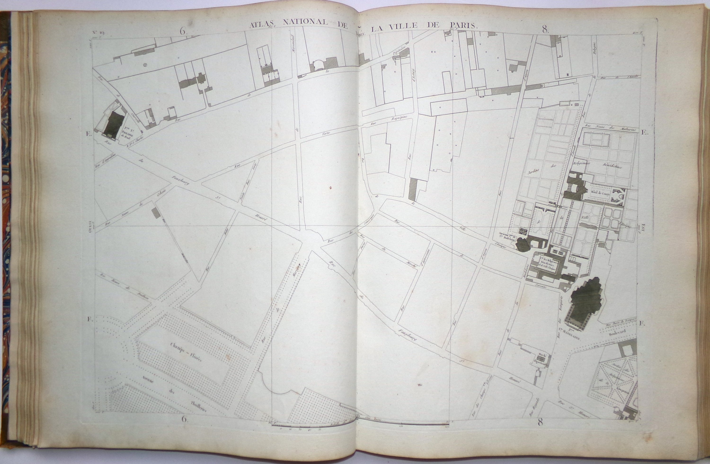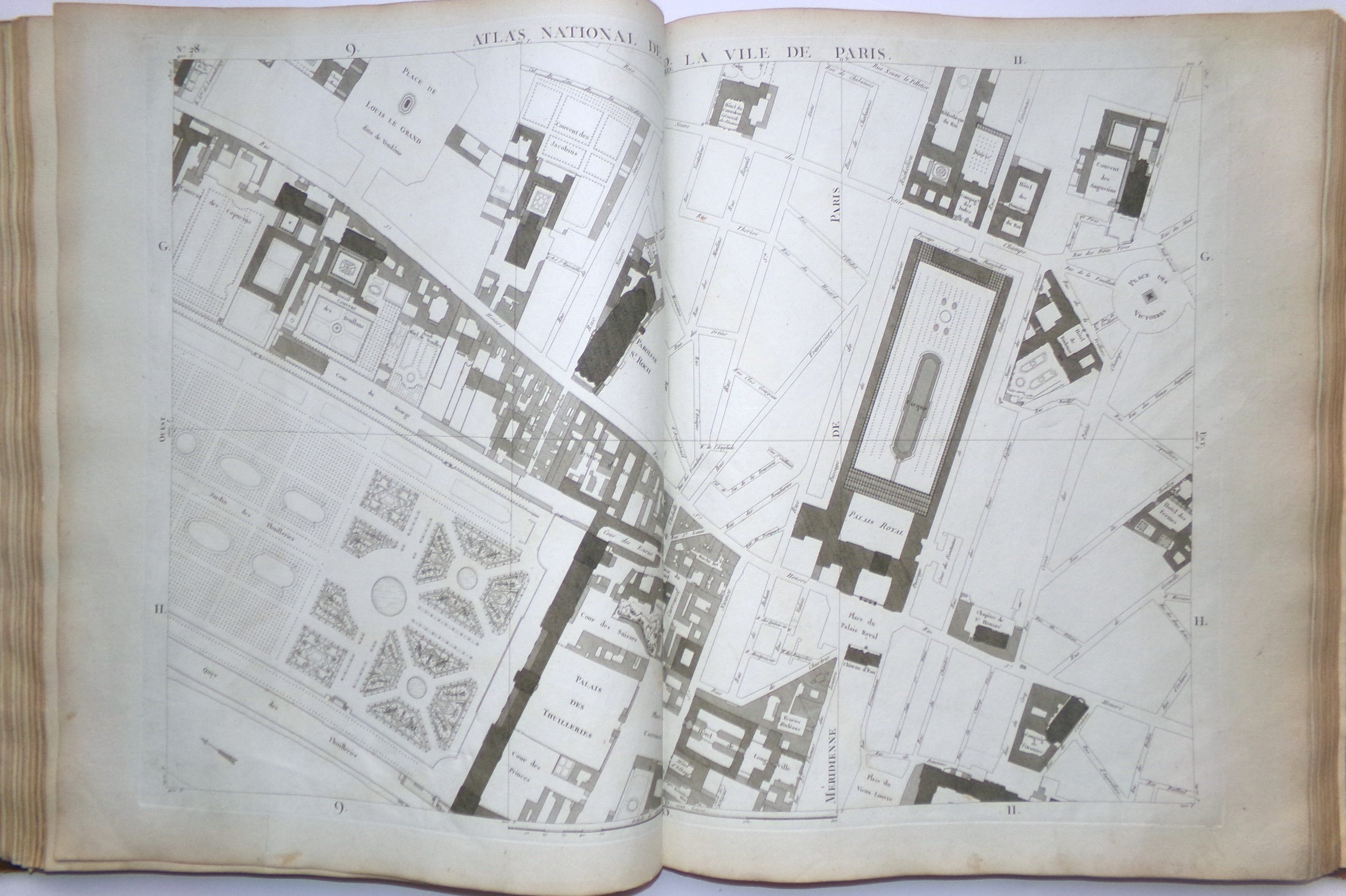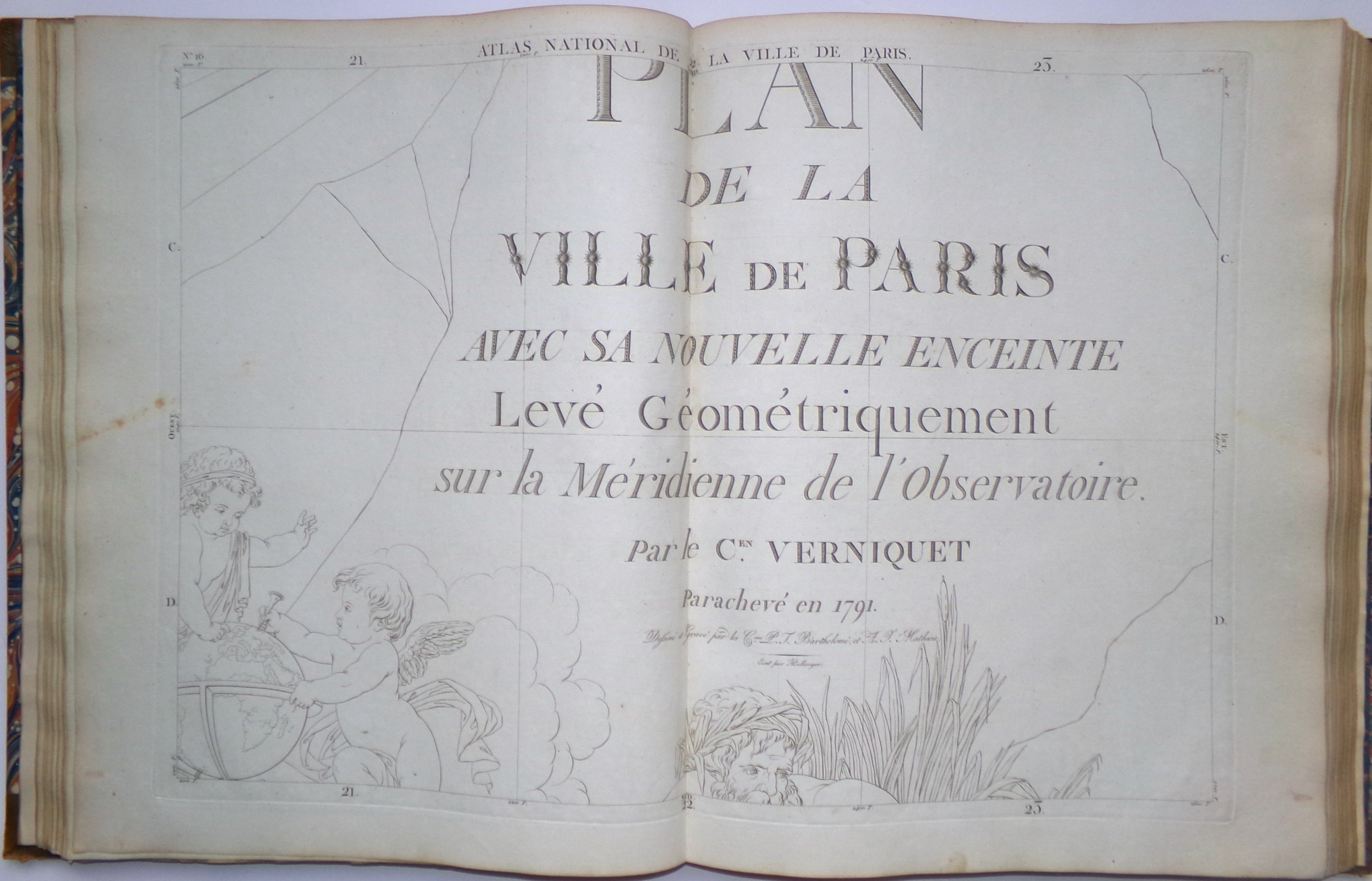 Cet important et rare atlas est composé de 69 feuilles gravées en taille douce et montées sur onglet (sur un total de 72 pl., mque pl. 5, 13 et 22) et d'une demi-feuille (détachée) portant le titre Atlas du Plan général de la Ville de Paris et représentant le tableau d'assemblage. La planche 70 offre le plan des opérations de trigonométrie menées sur Paris. La planche 16 comporte le titre général, qui mentionne l'ouvrage « parachevé en 1791 ». La liste des noms des rues occupe tout ou partie des planches 49, 50, 57, 58, 59, 66 et 67. Exemplaire tiré sur des papiers vergés variés, certaines feuilles azurées ; la plupart des marges ont été conservées.