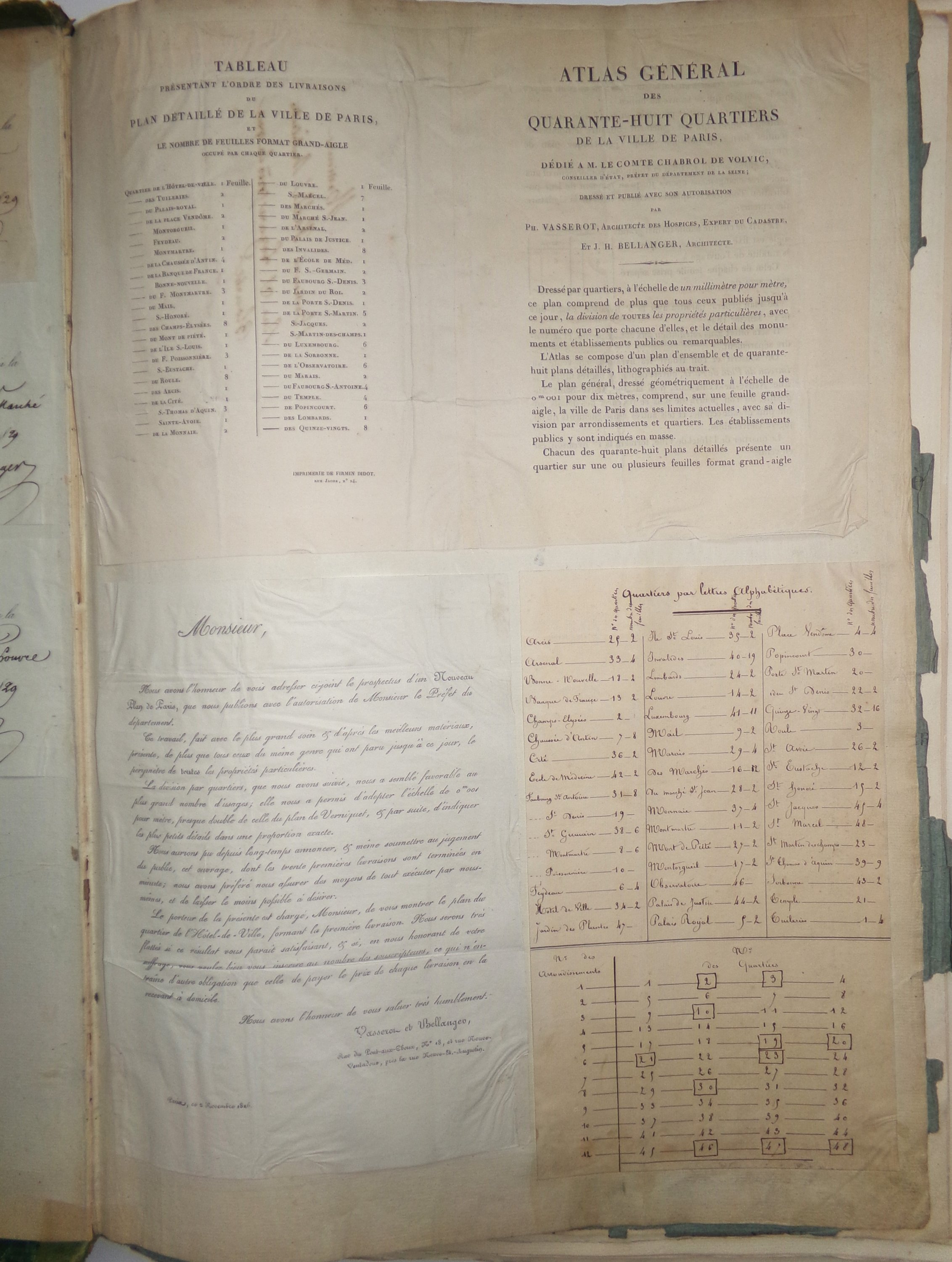 Contrecollés sur la 2e de couverture : 7 reçus de souscription signés par J.H. Bellanger et remis à M. Vallet, 1828-1830 ; et sur la 1ère page : prospectus de présentation de 1826 et tableau manuscrit détaillant la répartition numérotée par quartier et le nombre de planches pour chaque quartier.