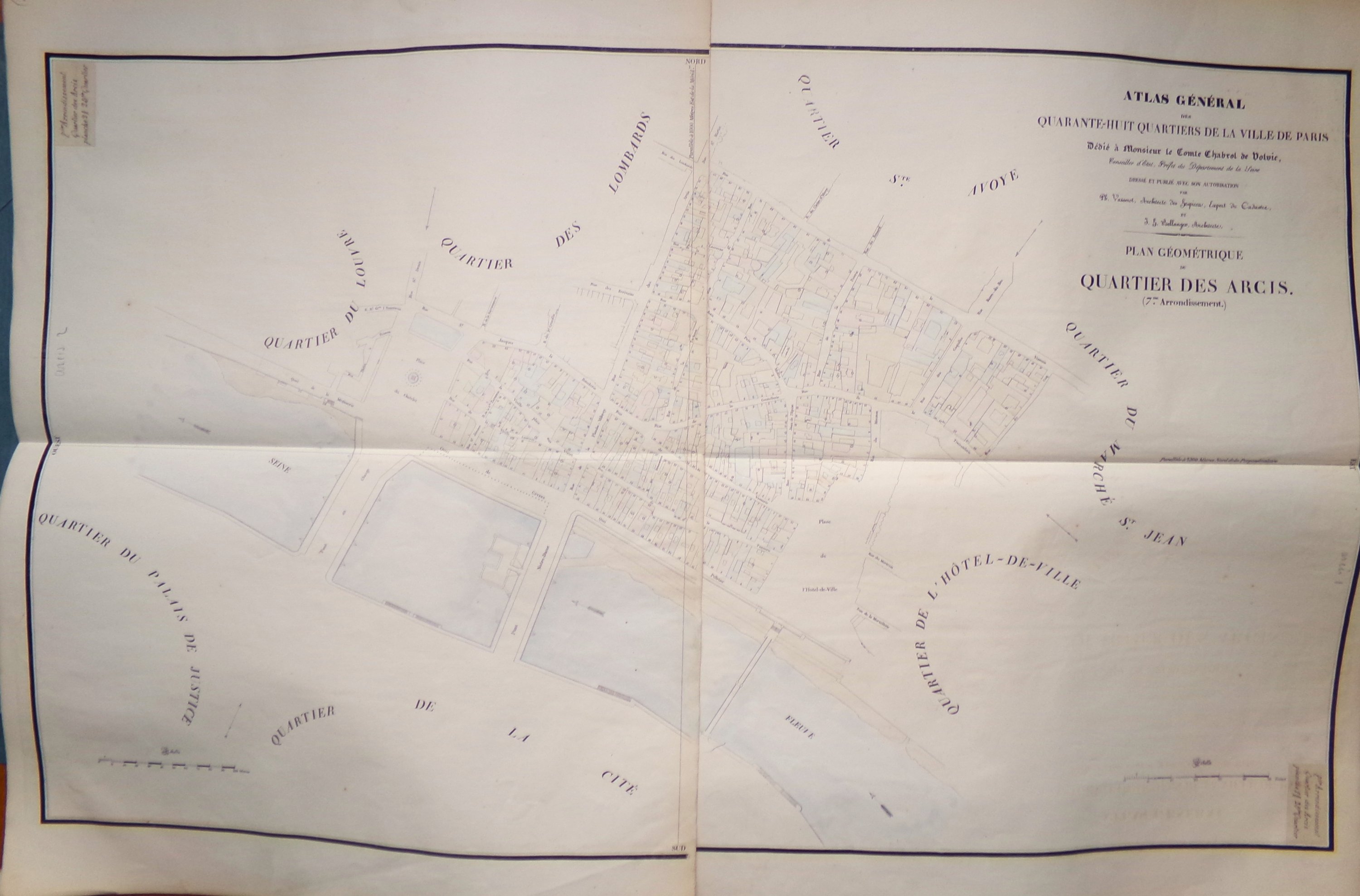 Ce premier plan parcellaire gravé de Paris avait pour ambition de reproduire les 48 quartiers de Paris. Seuls 37 quartiers ont été publiés, livrés à l’époque sous chemises bleutées imprimées de chacune 4 feuilles, formant un atlas de 3 vol. contenant au total 155 planches.
