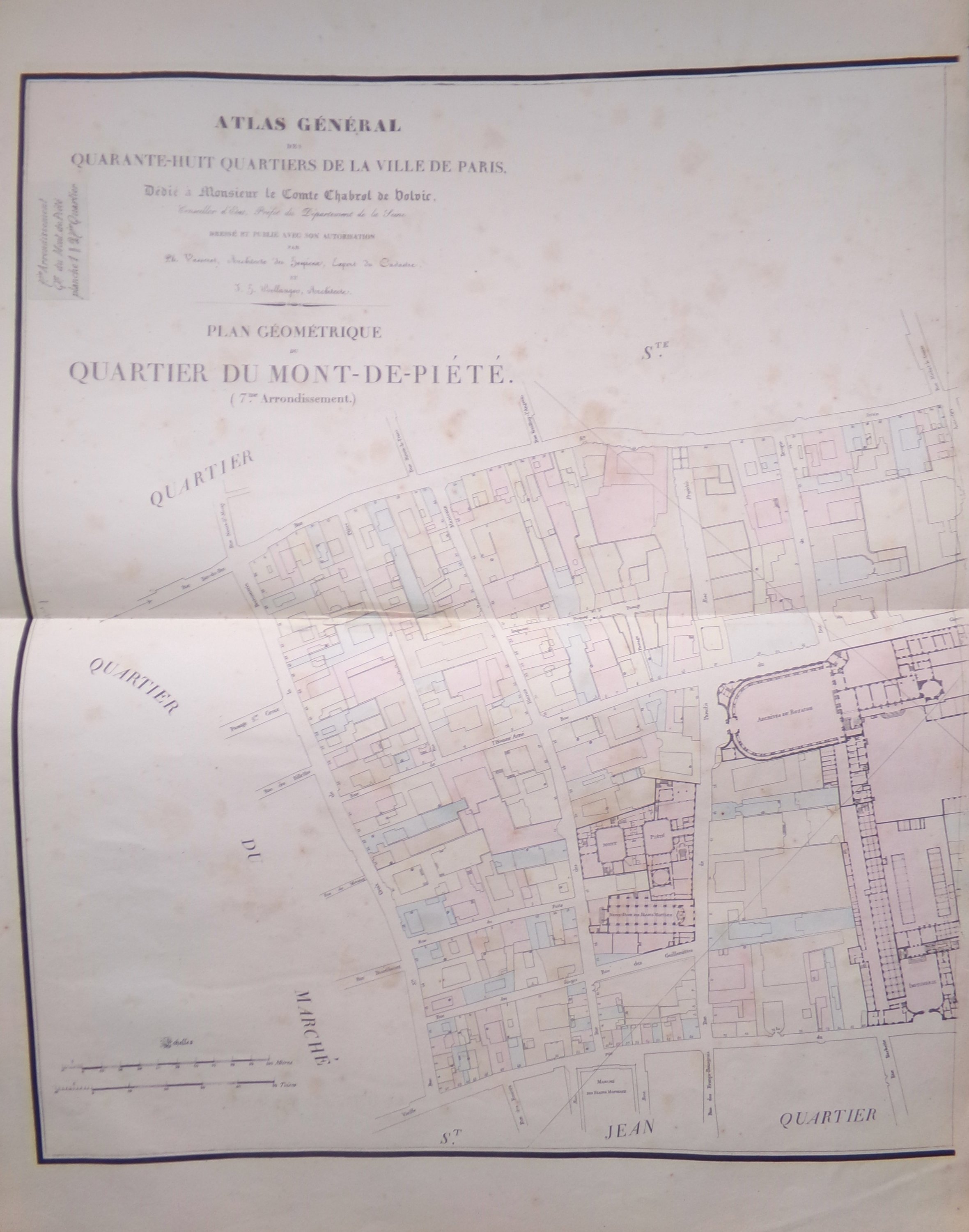 Plan détaillé de la ville de Paris dédié à M. le comte de Chabrol de Volvic, conseiller d’Etat, préfet du département de la Seine, dressé géométriquement à l’échelle d’un millimètre pour mètre, par Ph. Vasserot, architecte des hospices, expert du cadastre, et J.H. Bellanger, architecte, et comprenant la division de toutes les propriétés avec le numéro que porte chacune d’elles, la distinction des bâtiments et des cours dans les maisons particulières et le détail des monuments et établissements publics ou remarquables. Paris, chez les auteurs, [1827-1836].