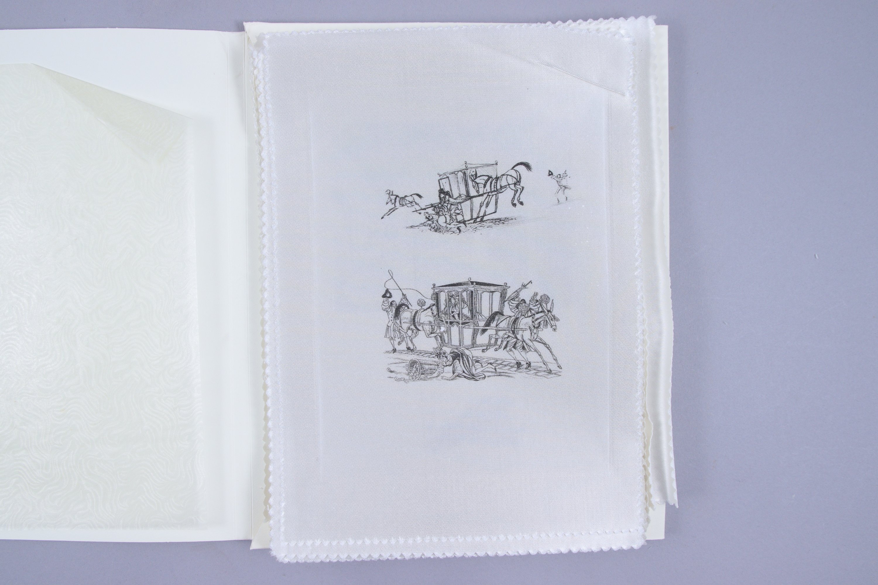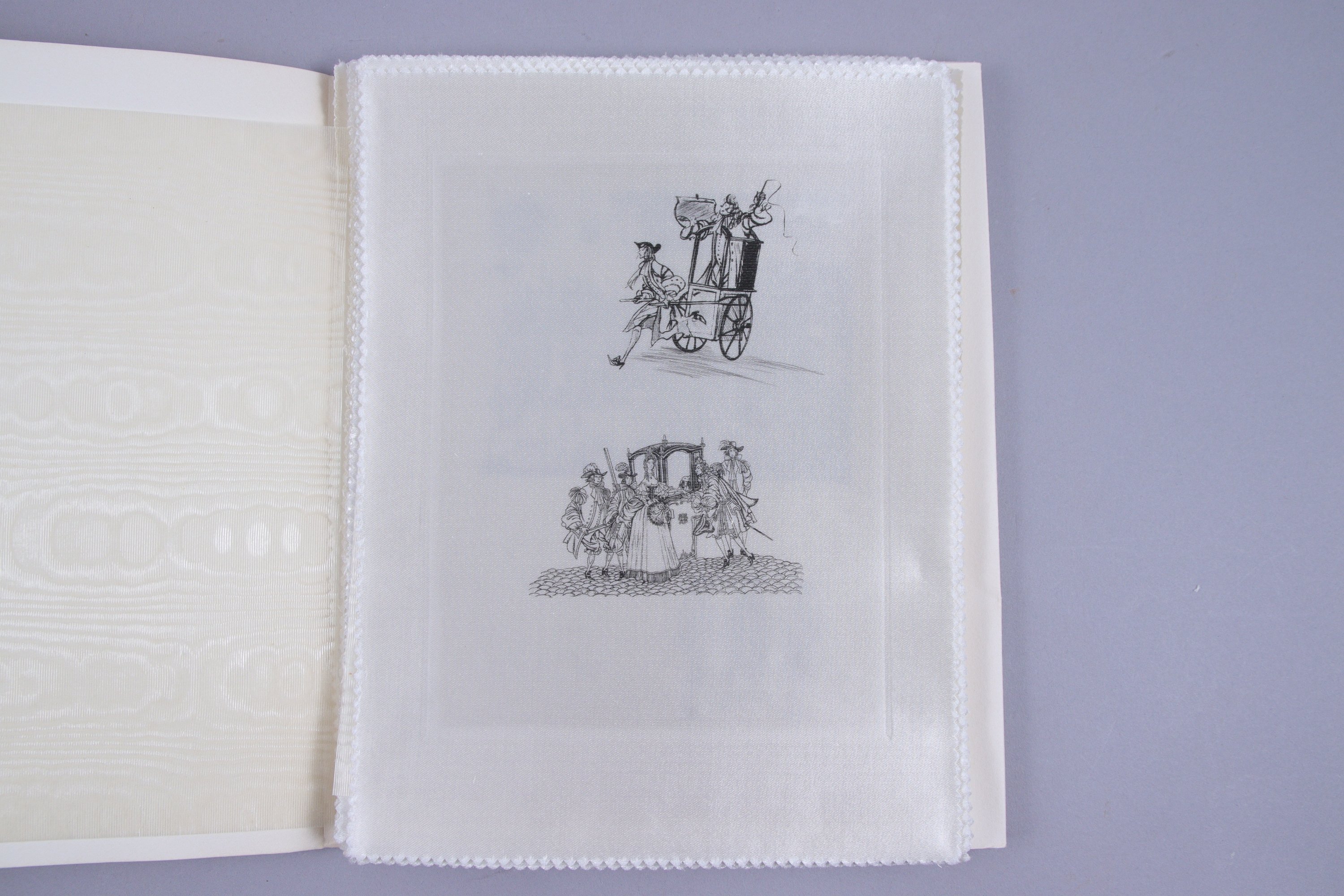 Tome III a : suite en couleurs sur soie ; suite en noir sur soie ; suite en noir sur vélin pur fil ; suite pour la décomposition des couleurs.Tome III b : 3 aquarelles originales ; texte illustré en couleurs ; 3 cuivres encrés originaux.
