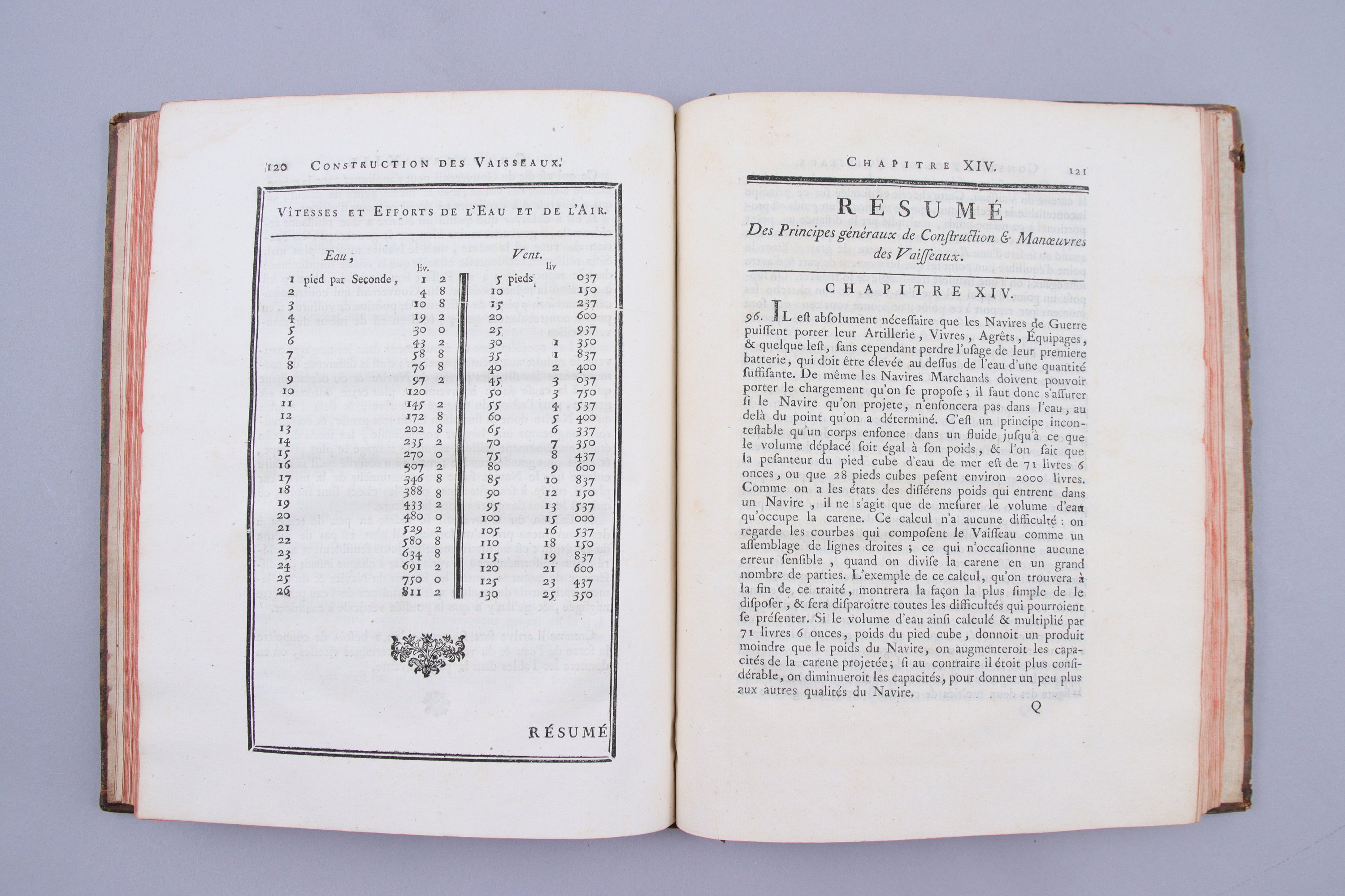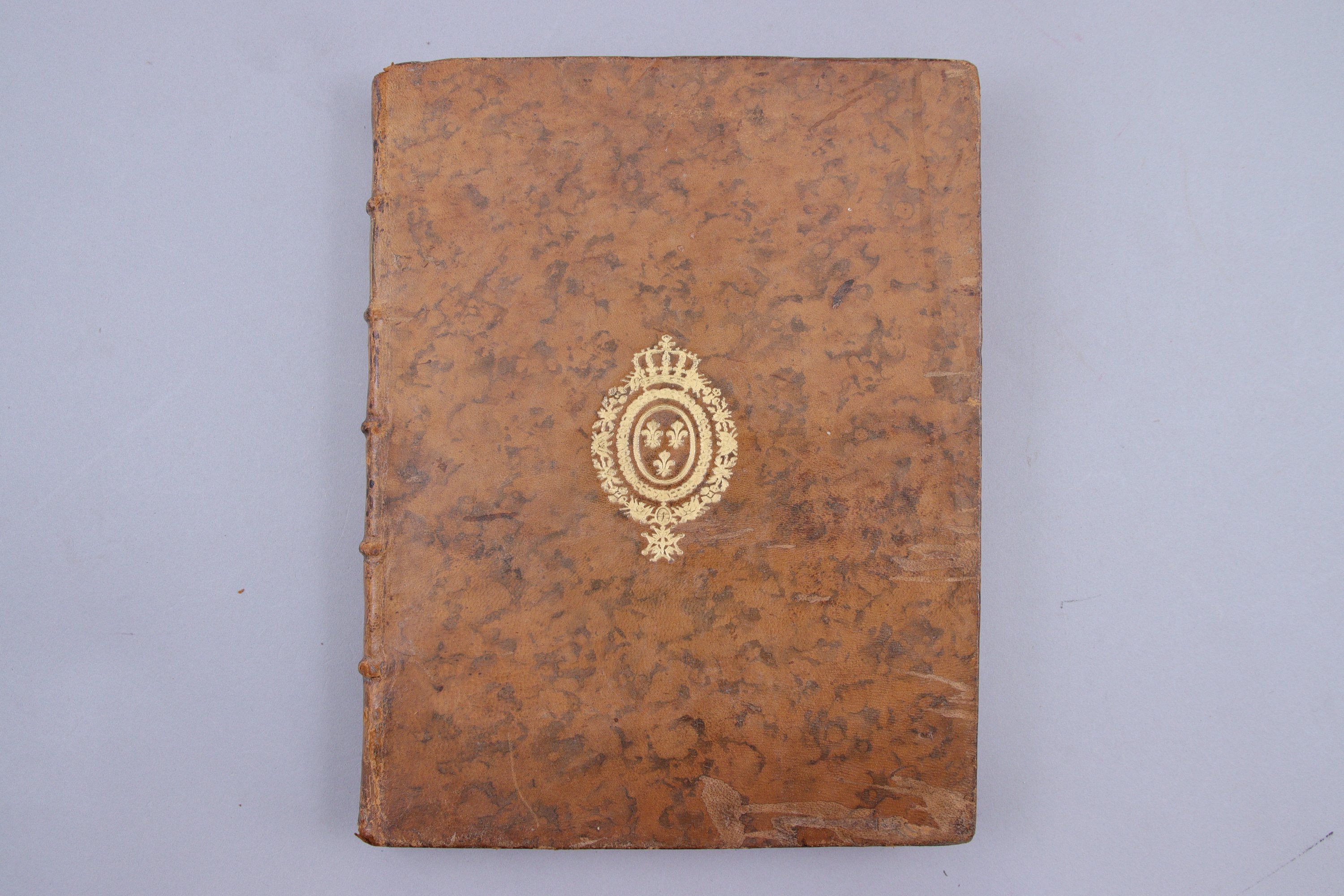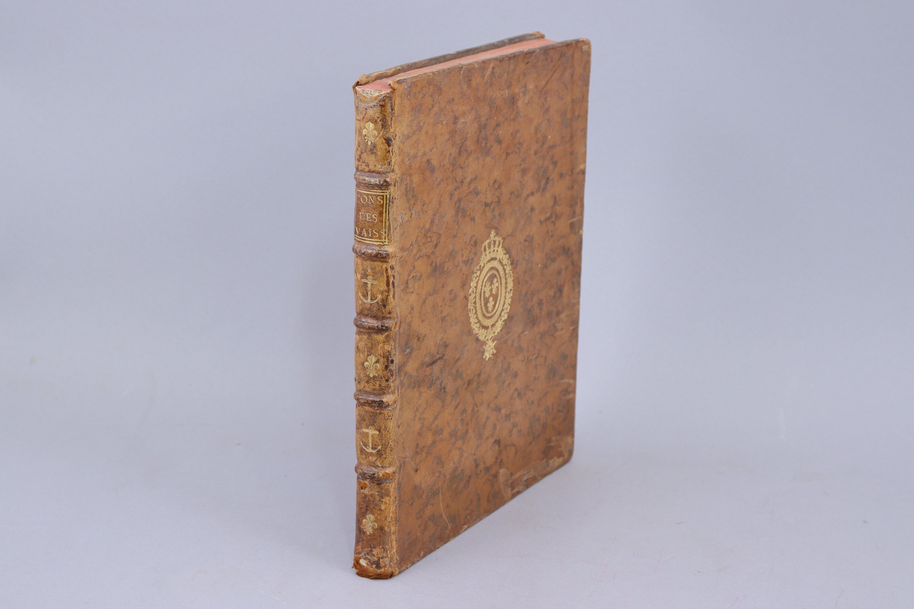 In-4°, (4 ff), 211 pages, (1 f) pour la "Correction de la hauteur du point vélique" ; 2 planches dépliantes. Plein veau raciné du temps ; armes royales au centre des deux plats ; dos à 5 nerfs, orné alternativement de fleurs de lys et d'ancres de marine. (Coiffe supérieure et 2 coins frottés ; mouillure claire dans la marge inférieure du feuillet de "Correction". ).