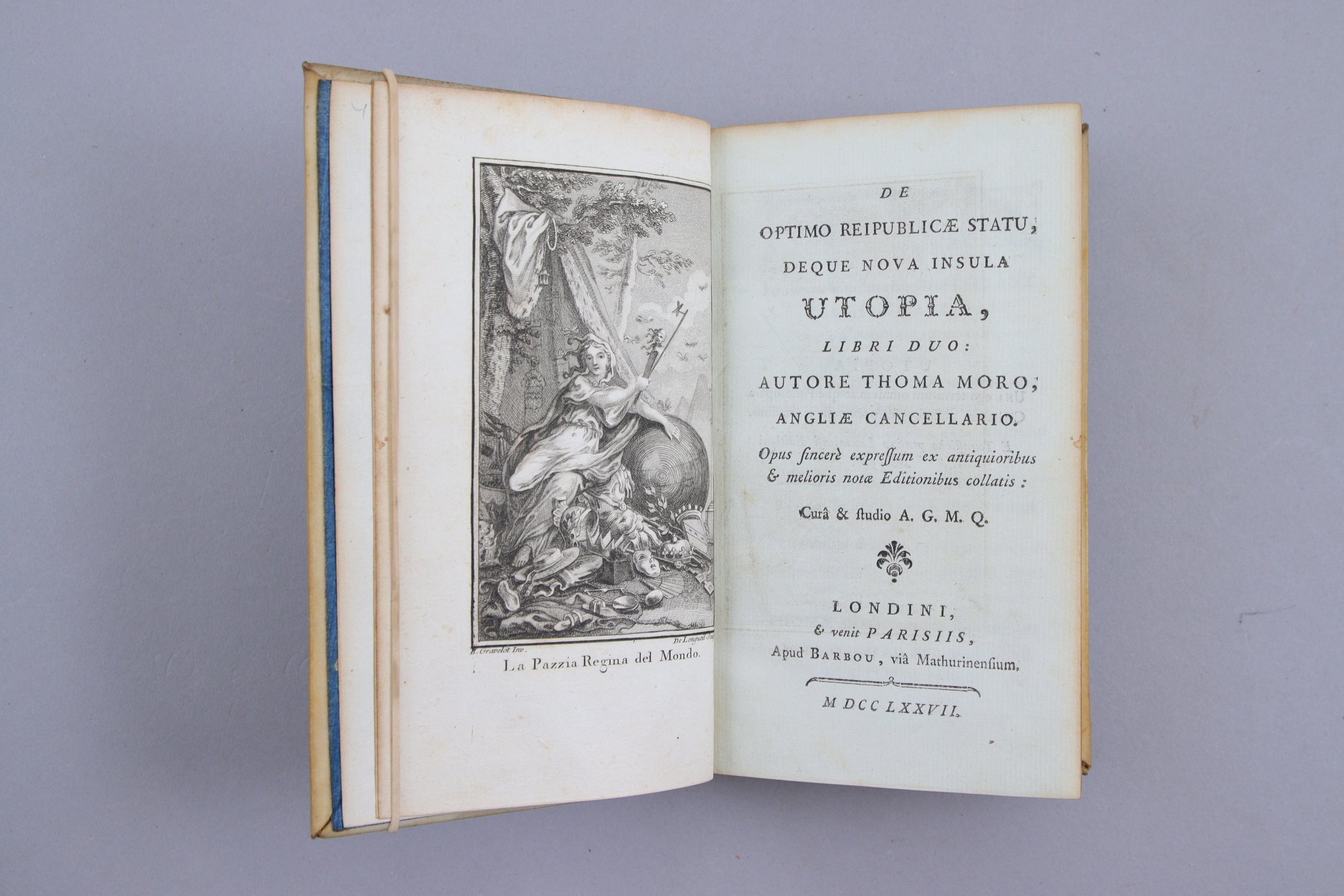 Superbe impression de Barbou, sur un papier de grande qualité. La seconde partie est la Stultitiae Laudatio (Eloge de la folie) d'Erasme, avec titre et collation séparés.