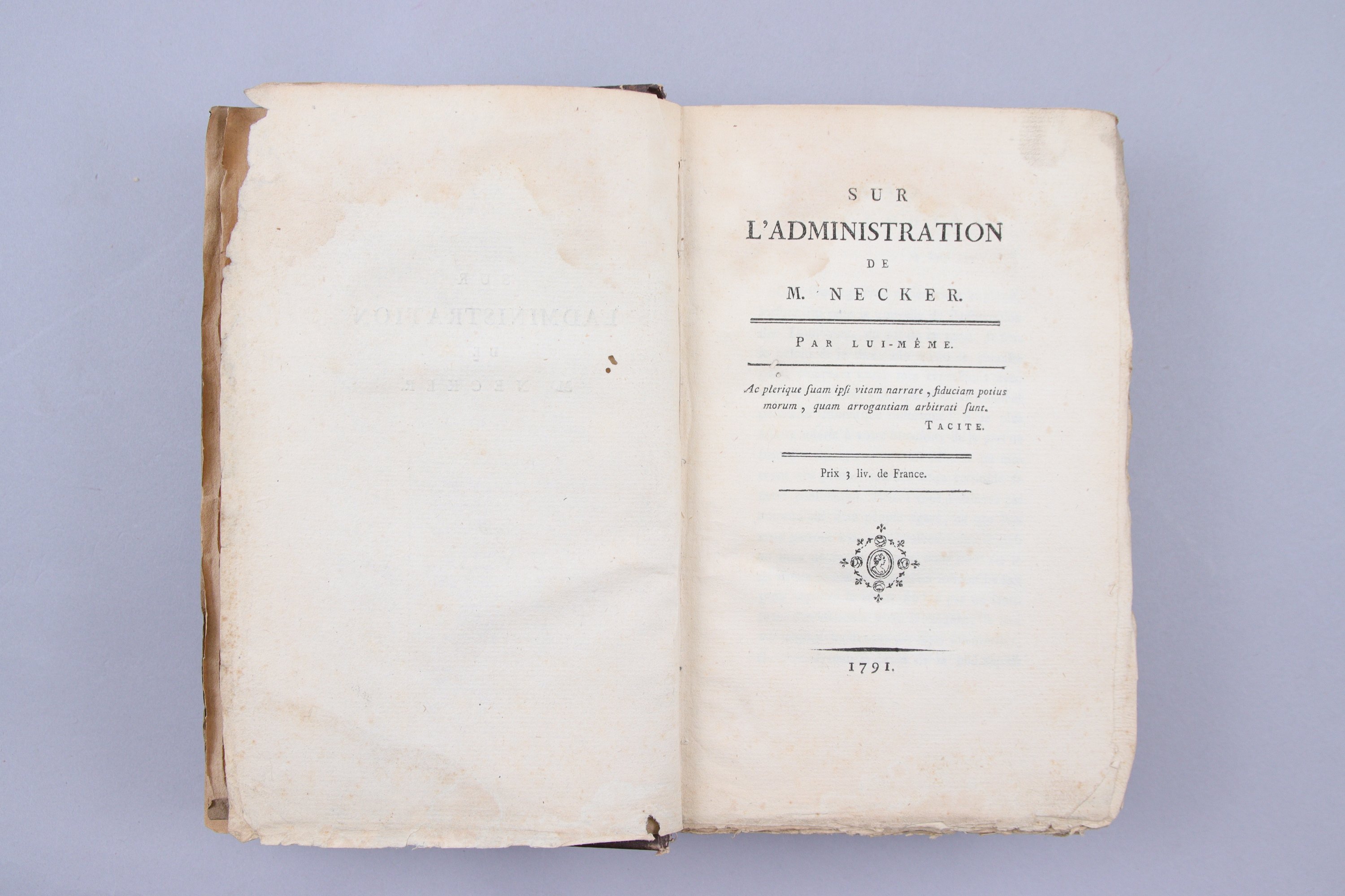 Une des 5 éditions à la date de l'édition originale. Plaidoyer pro domo de Necker, "victime malheureuse d'une suite d'injustices dont les annales de l'histoire ne présentent que peu d'exemples" (feuillet A).