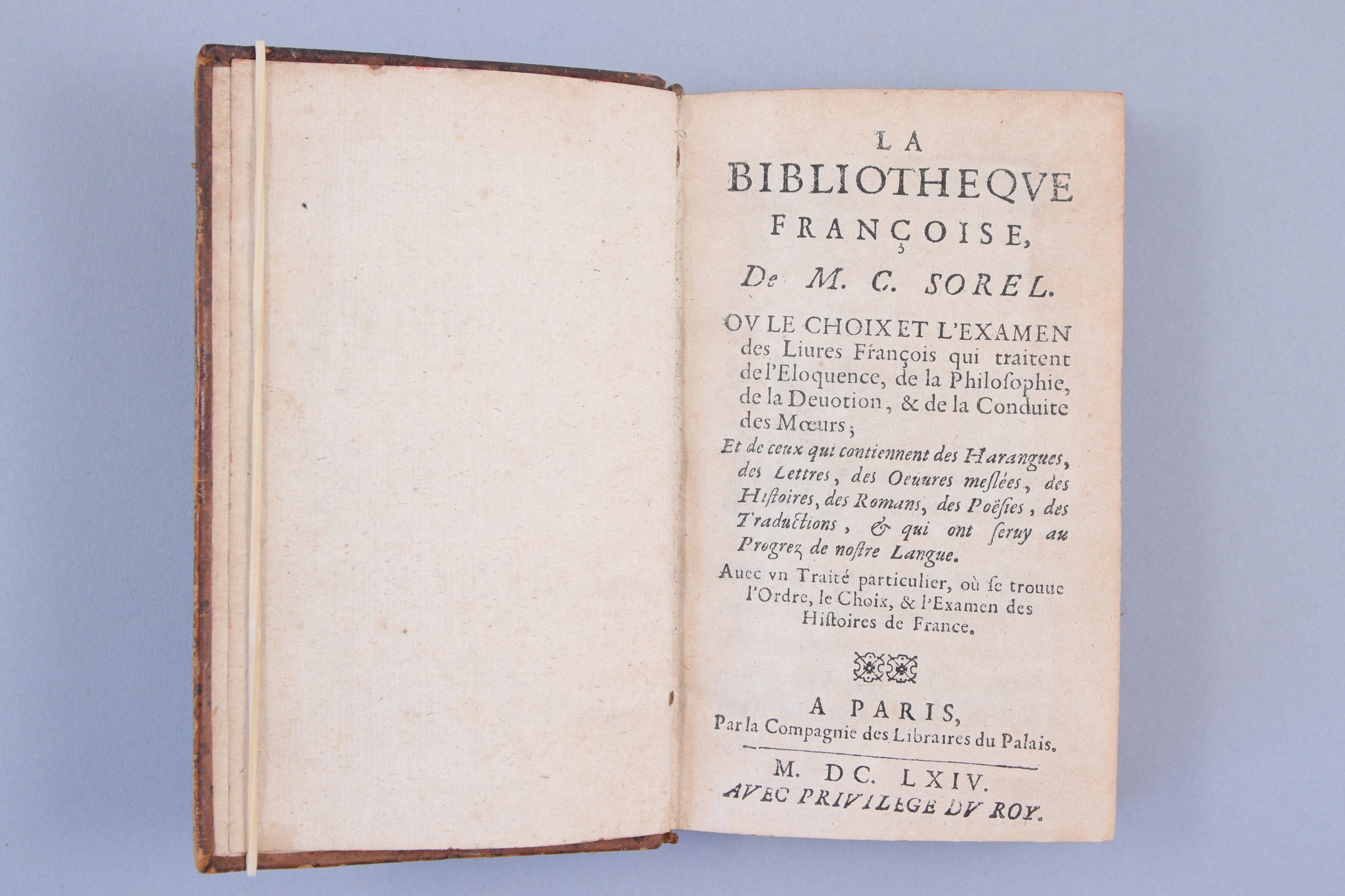 La Bibliothèque françoise de M. C. Sorel, ou le choix et l'examen des Livres François qui traitent de l'Eloquence, de la Philosophie, de la Dévotion et de la Conduite des Moeurs ; et de ceux qui contiennent des Harangues, des Lettres, des Oeuvres meslées, des Histoires, des Romans, des Poésies, des Traductions, & qui ont servi au Progrez de nostre Langue.