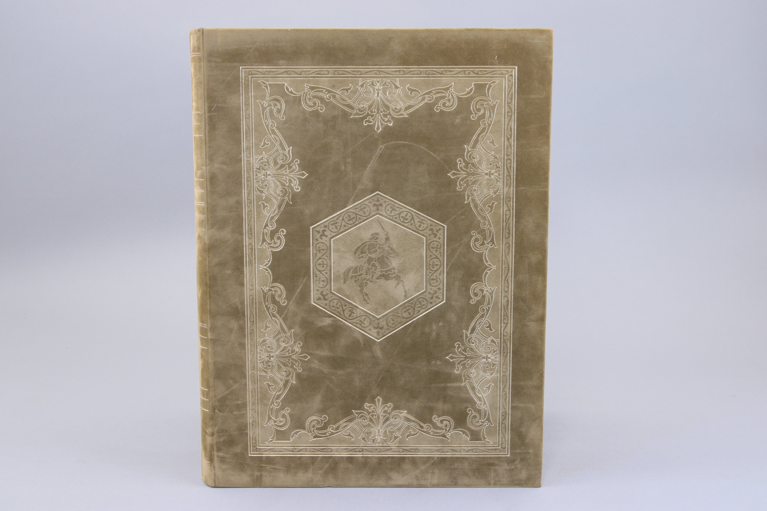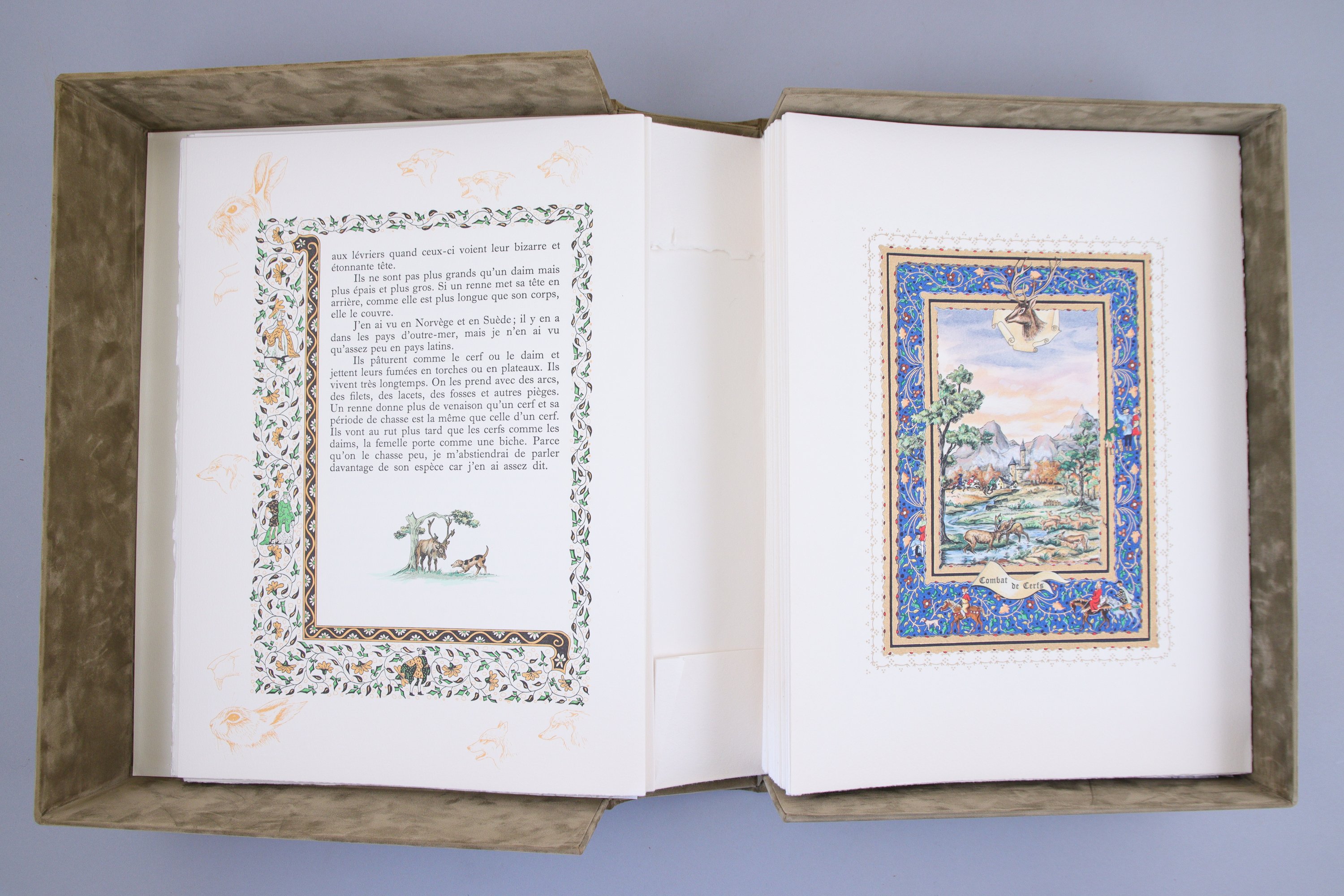 Tirage à 810 exemplaires (n°421). Chaque feuillet est illustré d'un encadrement en couleurs, dans "le style" des manuscrits enluminés, et de nombreuses planches hors-texte en couleurs.
