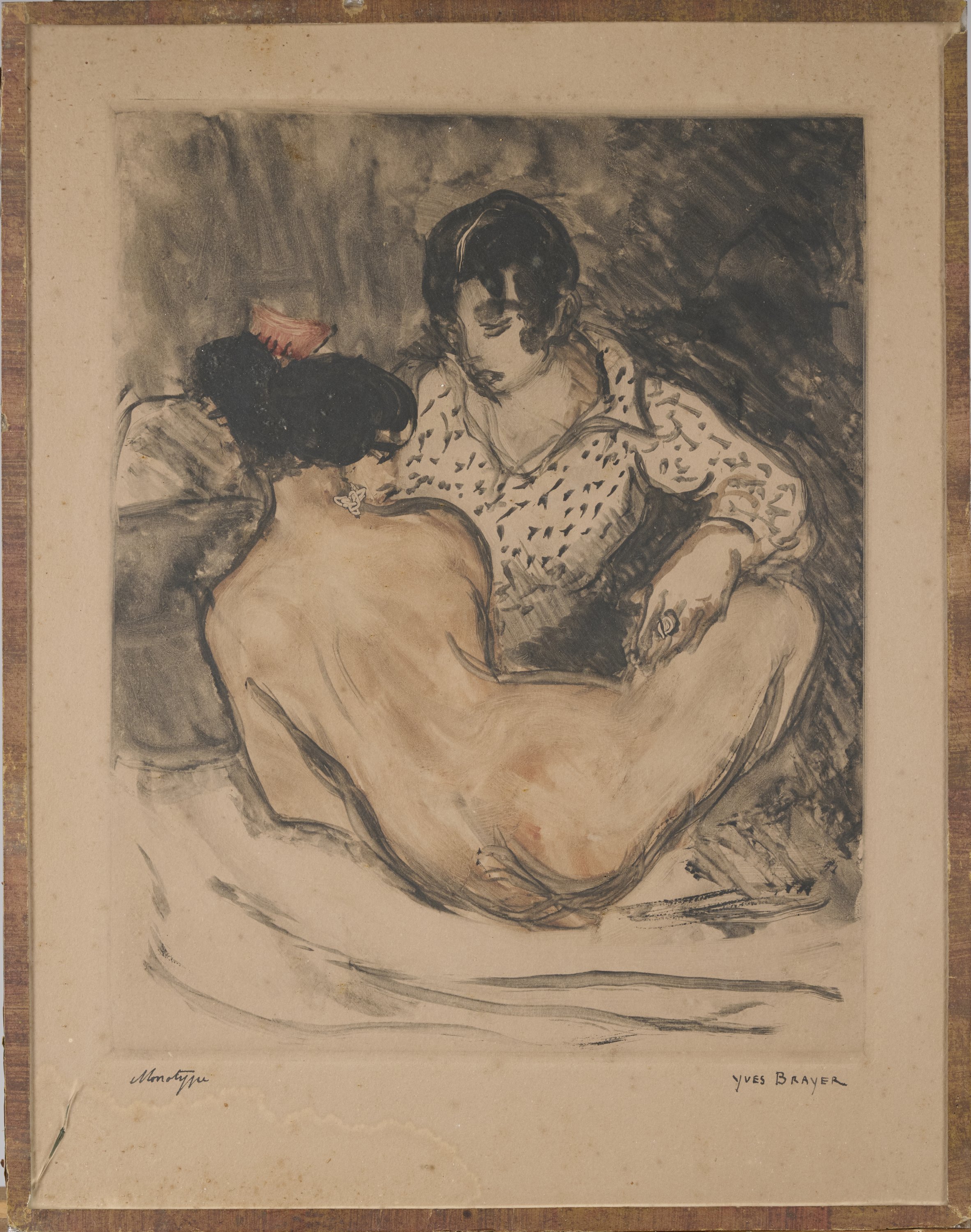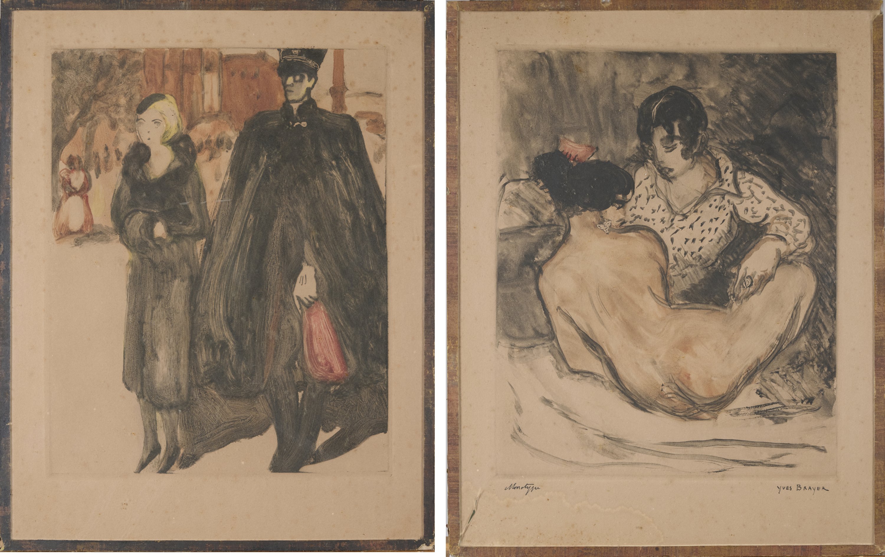 En 1932, Jean Niermans et Yves Brayer exposent ensemble lors de l'exposition annuelle des pensionnaires de l'académie de France à Rome, la Villa Médicis. Ces deux monotypes sont proches d'exemplaires publiés dans des ouvrages illustrés par Yves Brayer. "L'officier et la dame" rappelle l'un des monotypes de "Rome d'aujourd'hui". Notre exemplaire serait un essai préliminaire, expliquant le fait qu'il ne soit pas signé. Une grande huile représentant le même sujet et datée de 1932 est conservée à Boulogne-Billancourt, au Musée des Années 30. L'estampe des "Deux amies" est quant à elle voisine de l'un des monotypes de l'ouvrage "Pièces condamnées" de Charles Baudelaire, composé de 11 monotypes originaux tous très différents. Nous remercions Monsieur Yves Brayer, fils unique et ayant droit de l'artiste, de ses précisions à propos de ces oeuvres.