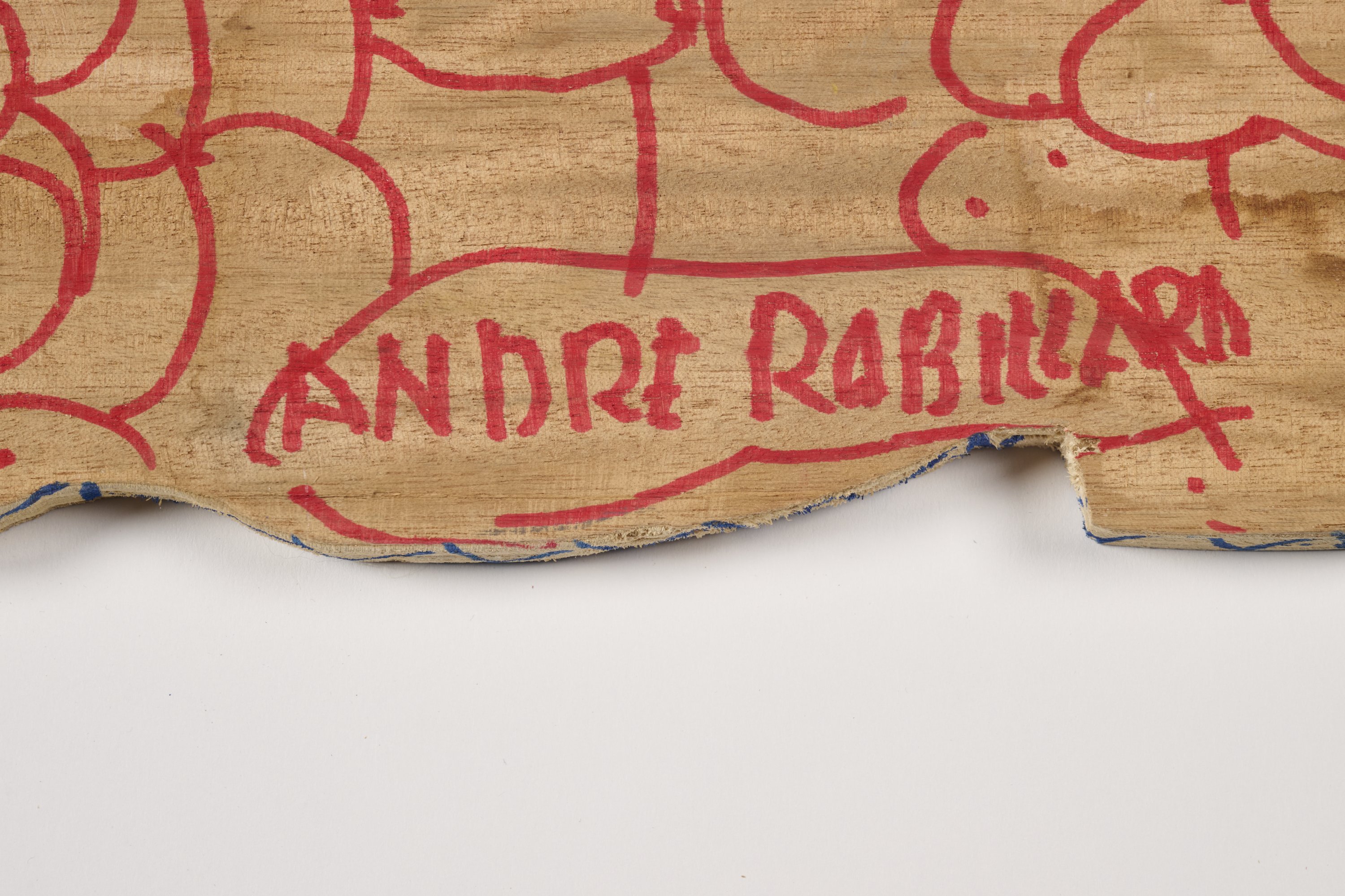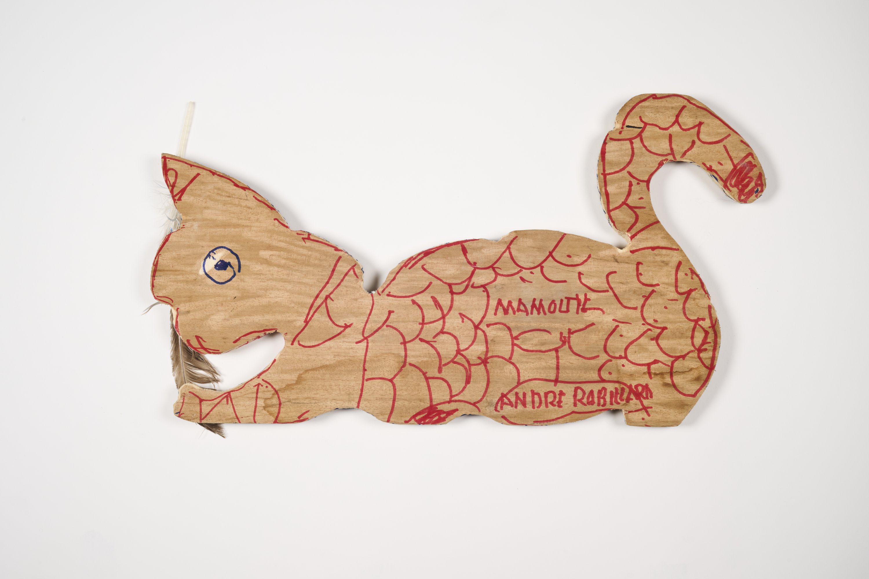Chat découpé dans du contreplaqué, dessin au feutre.