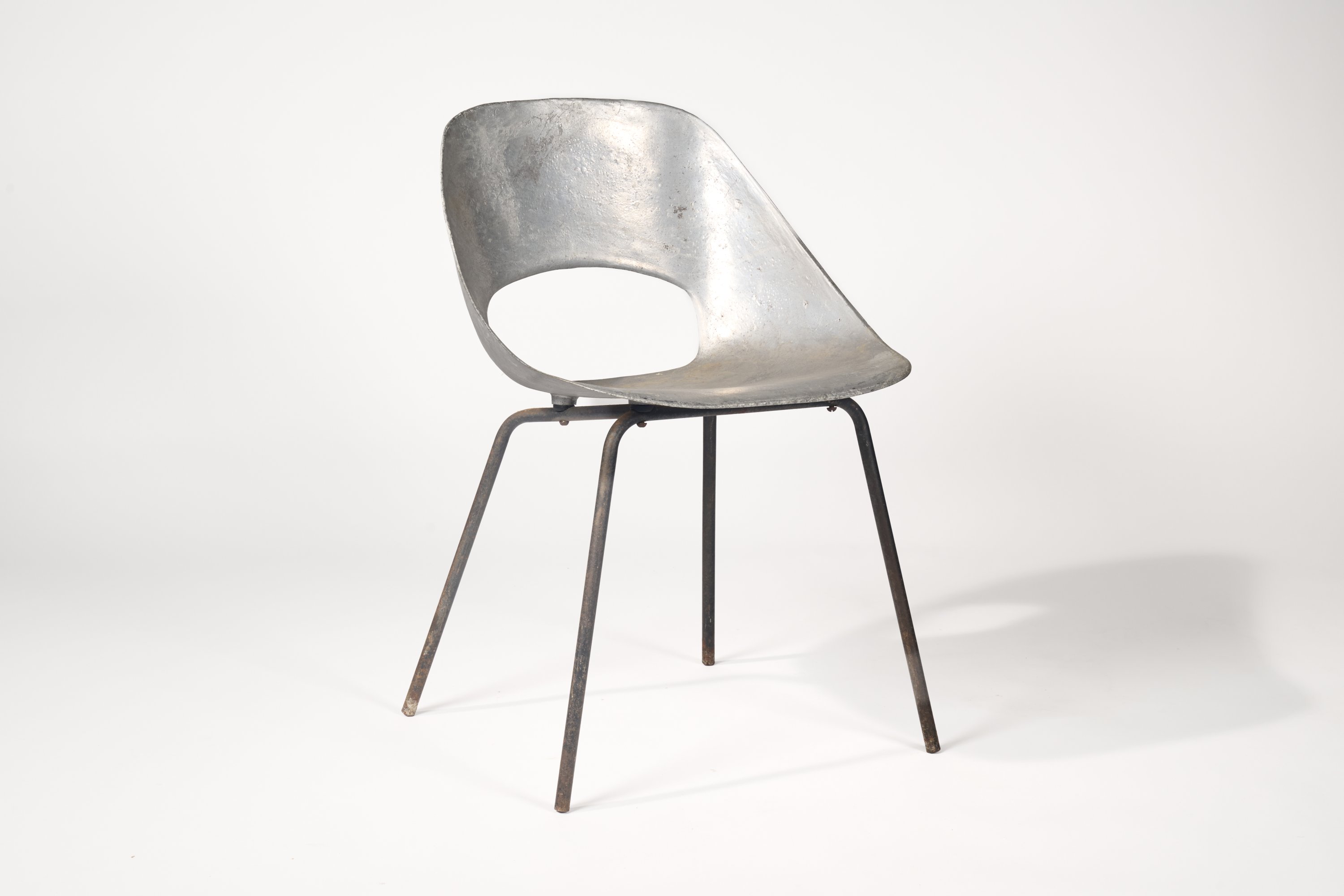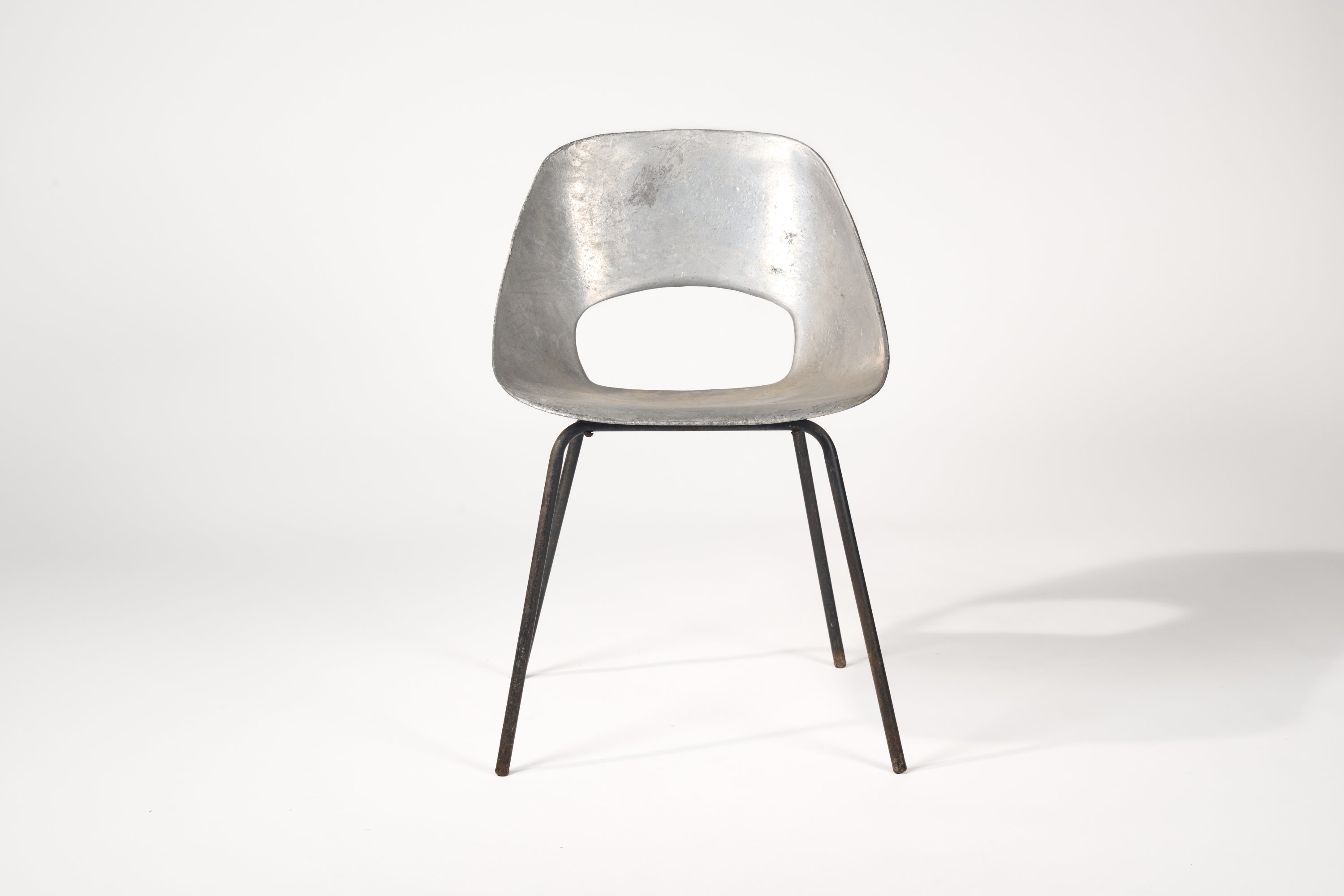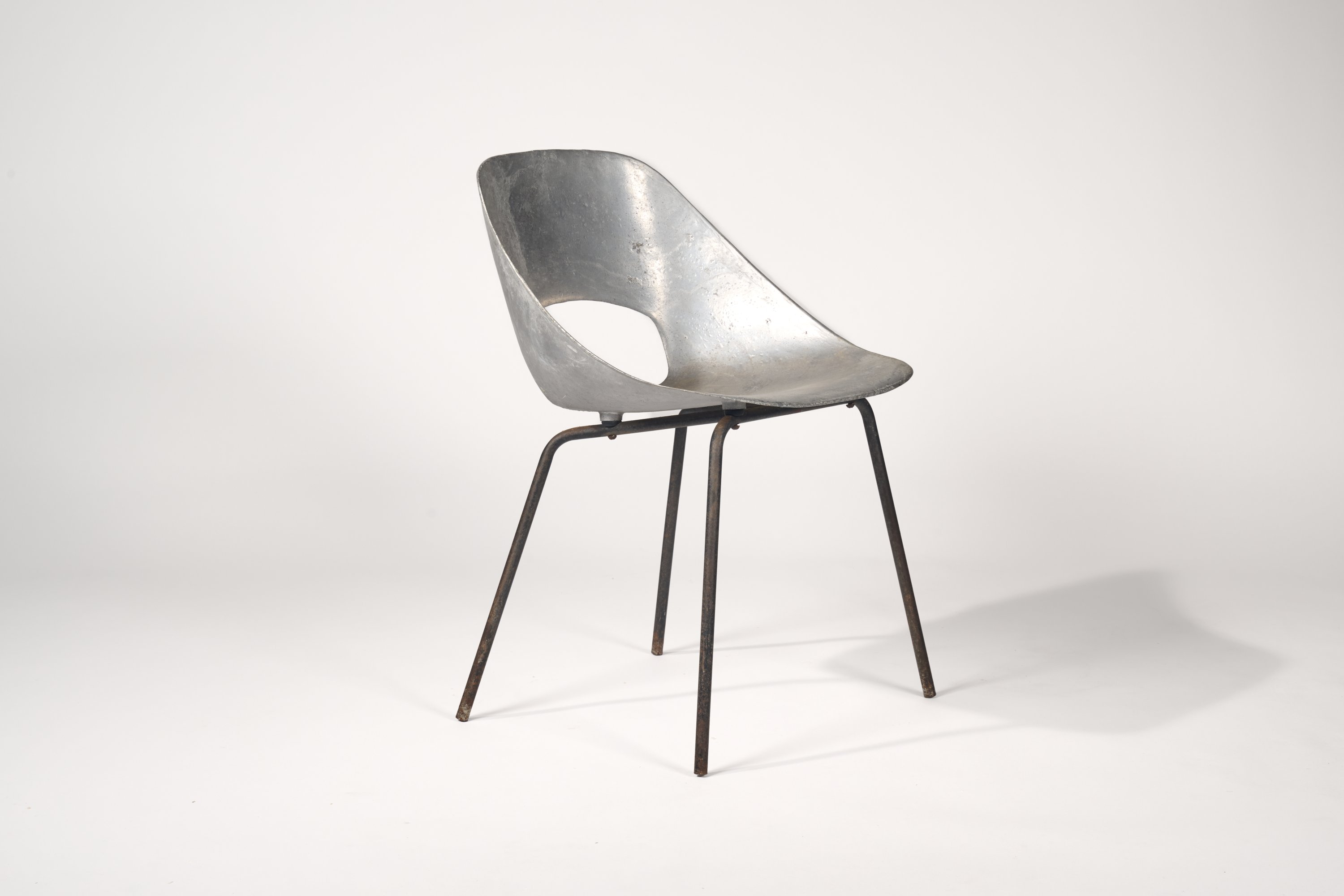 Coque en aluminium reposant sur un piétement en métal laqué noir à quatre pieds.