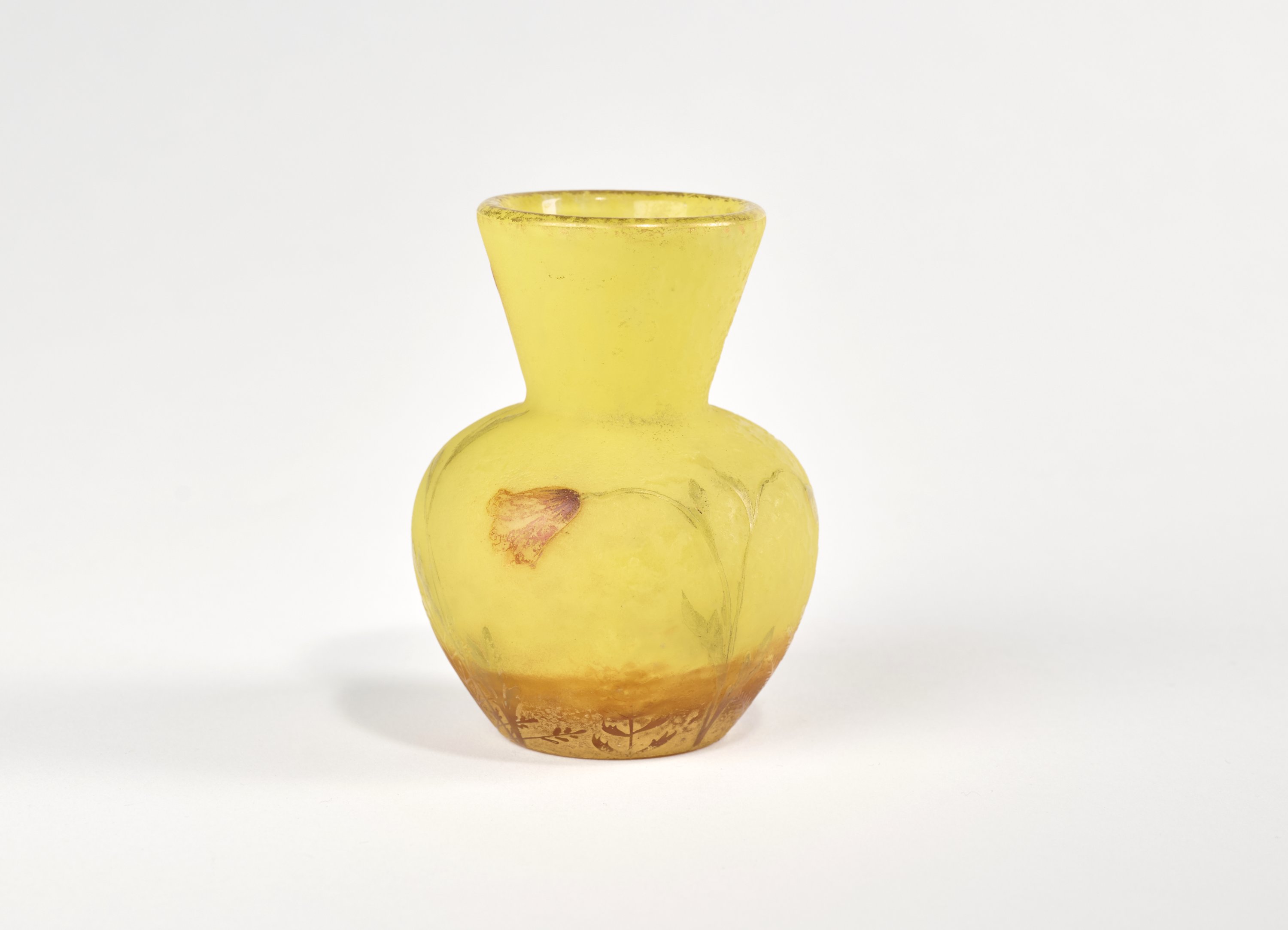 à épaulement renflé et col tronconique. Verre marmoréen jaune et orangé à décor multicouche, gravé à l'acide et émaillé de coquelicots sur fond givré.