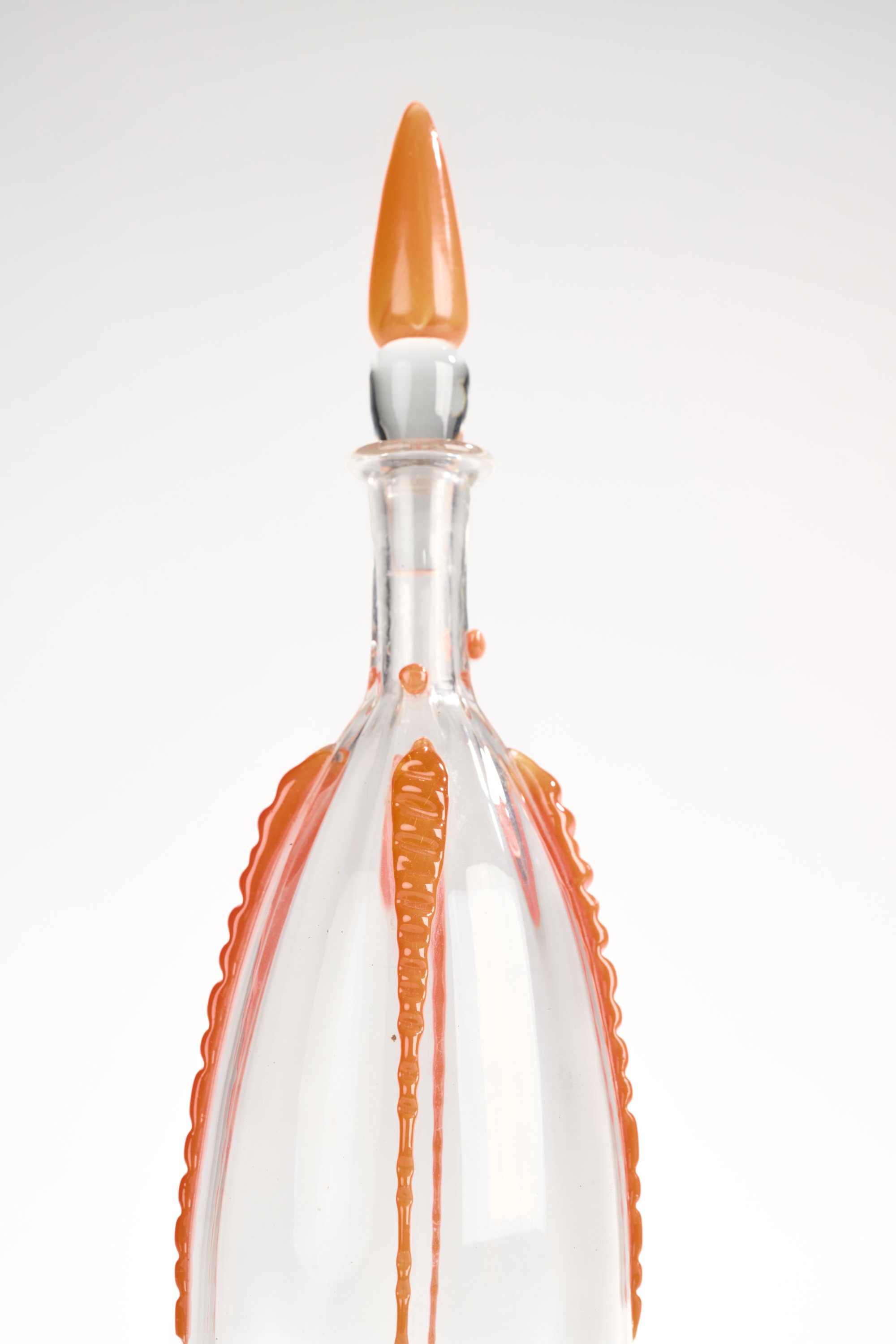 Verre blanc et verre orangé rapporté à chaud de filets et perles. Bouchon en verre orangé.