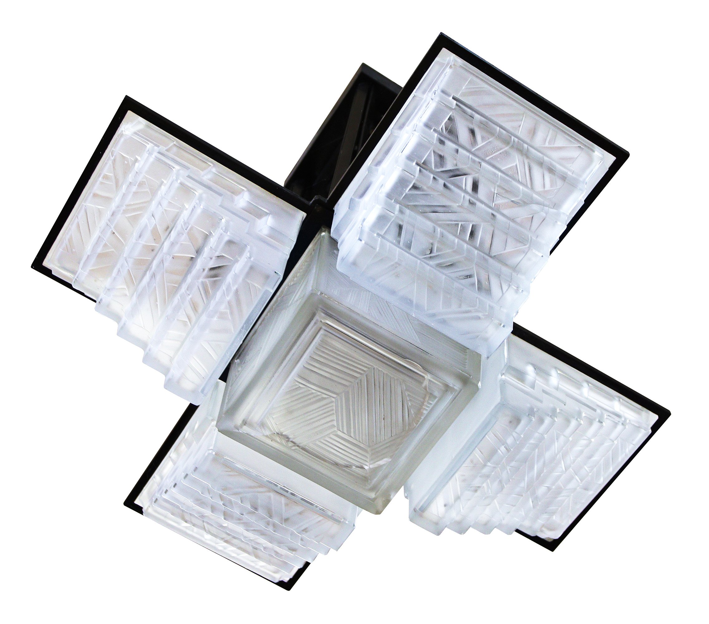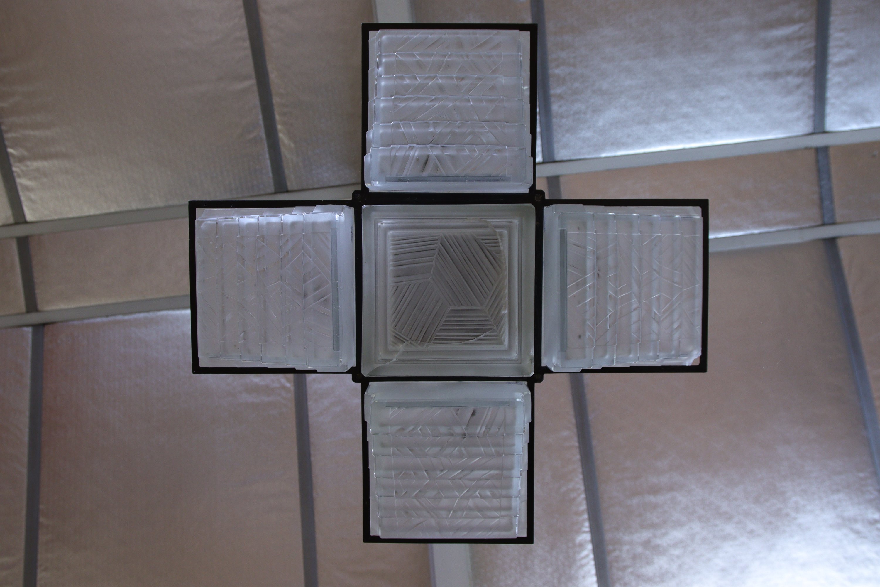 Cinq lumières en fer laqué noir et verre, à fût carré supportant les abat-jour à gradins.
