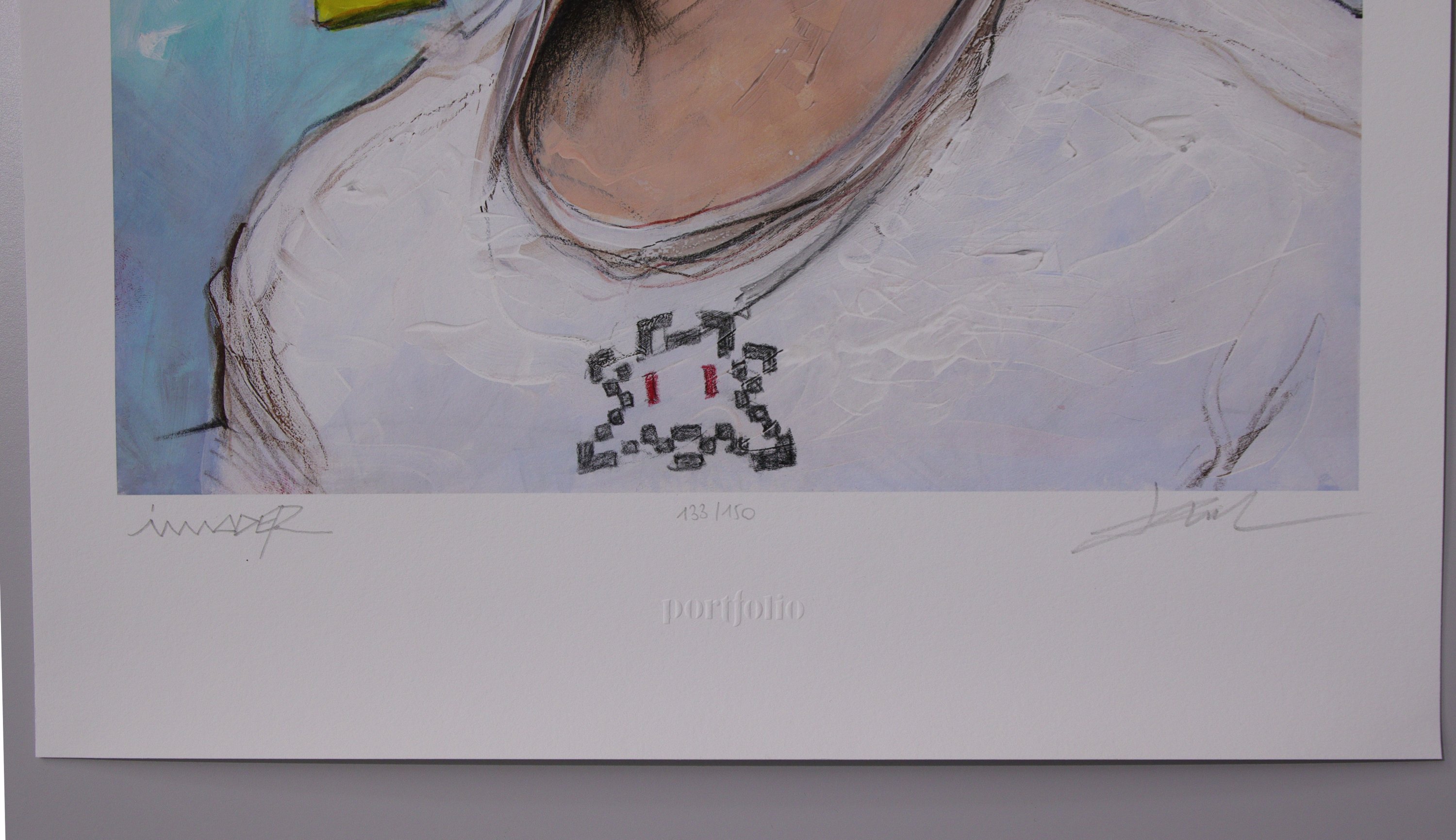 Signée et datée dans la planche. Signée au crayon en bas à droite par Enki Bilal, à gauche par Invader. Justifiée "133/150". Édition de la revue Portfolio.