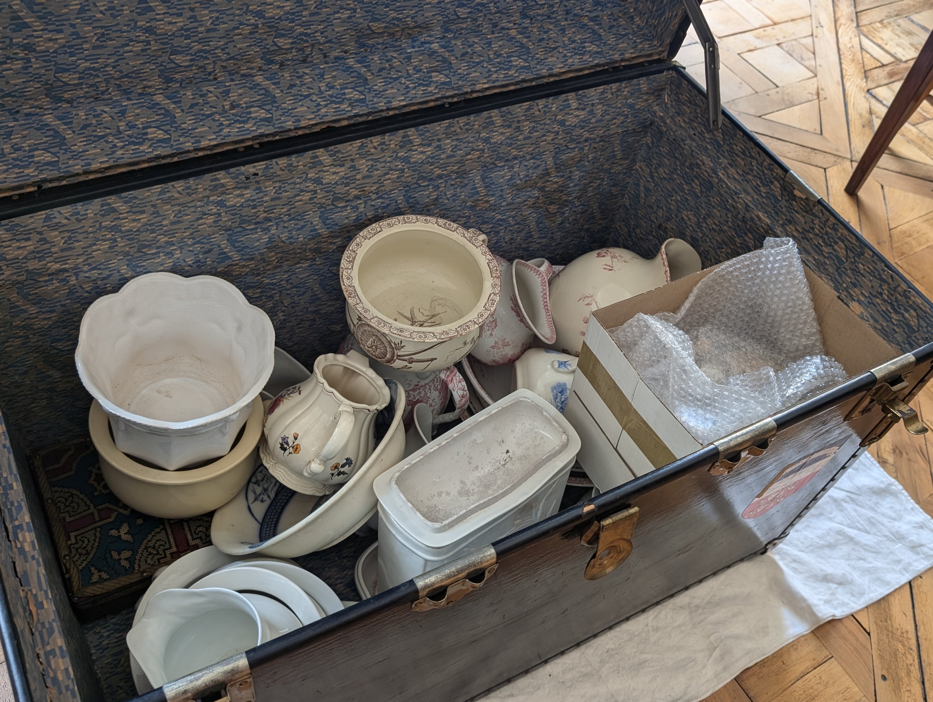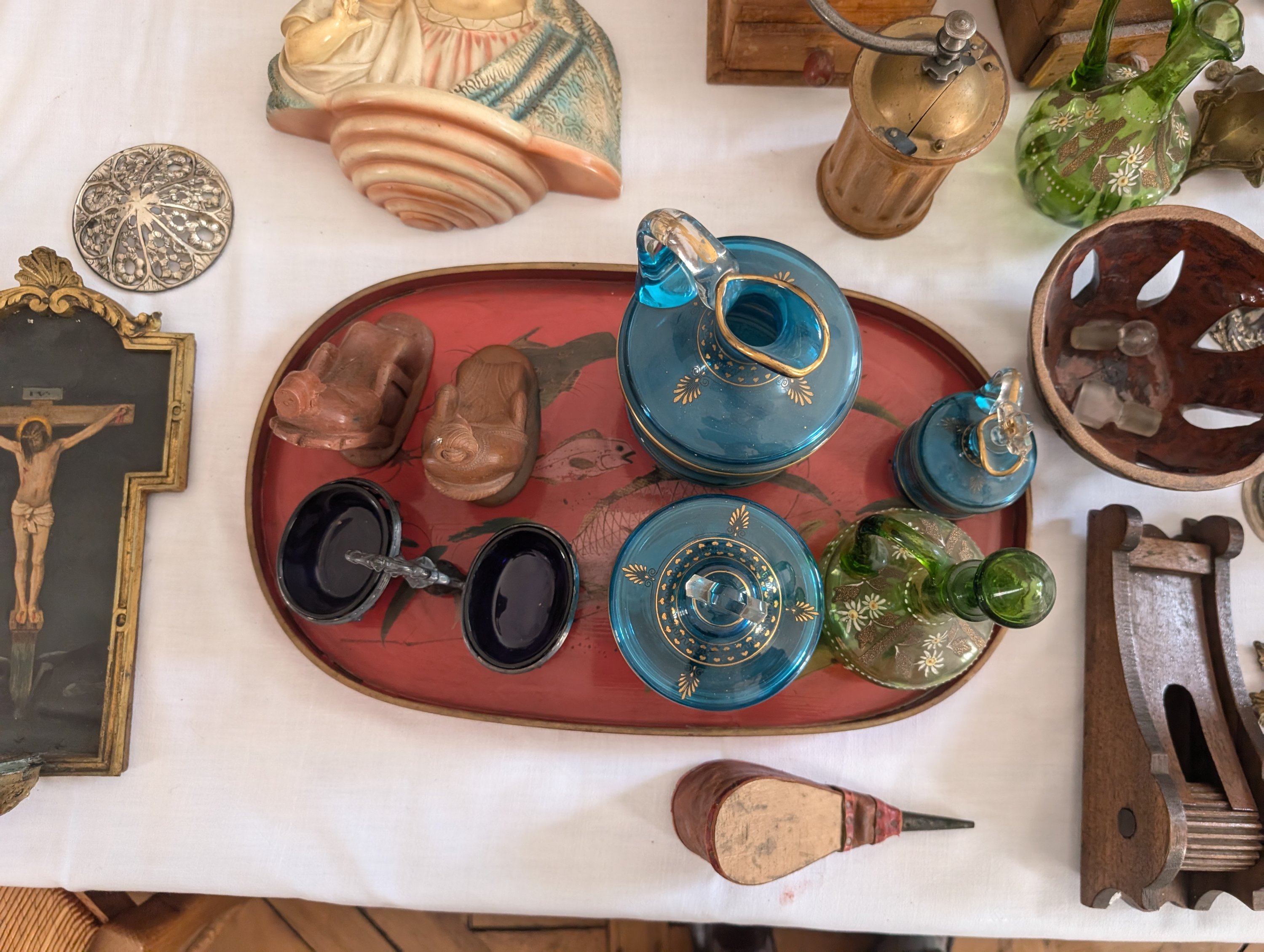 Contenu des greniers de la maison mère de la congrégation des soeurs du Bon Secours : vases d'autel, crucifix, lampes à pétrole, cadres, machine à tuyauter les coiffes, etc.