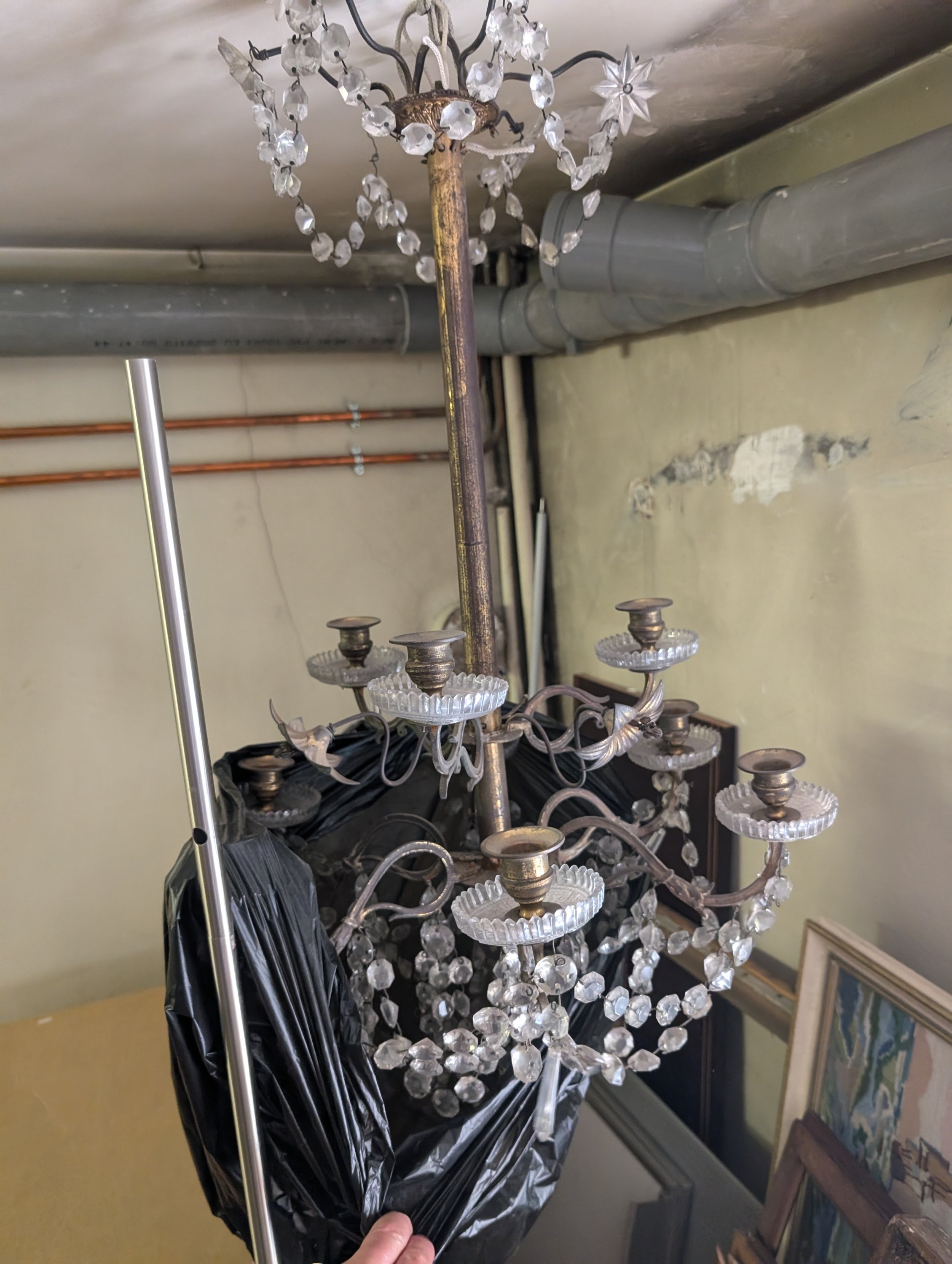 Contenu des greniers de la maison mère de la congrégation des soeurs du Bon Secours : vases d'autel, crucifix, lampes à pétrole, cadres, machine à tuyauter les coiffes, etc.