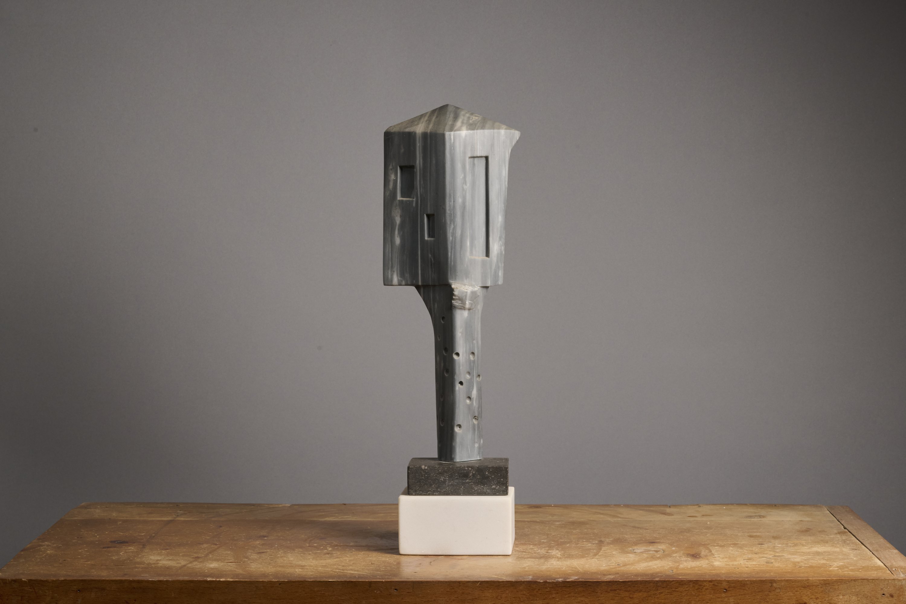 Socle de marbre gris posé sur une base en pierre blanche de Belgique.