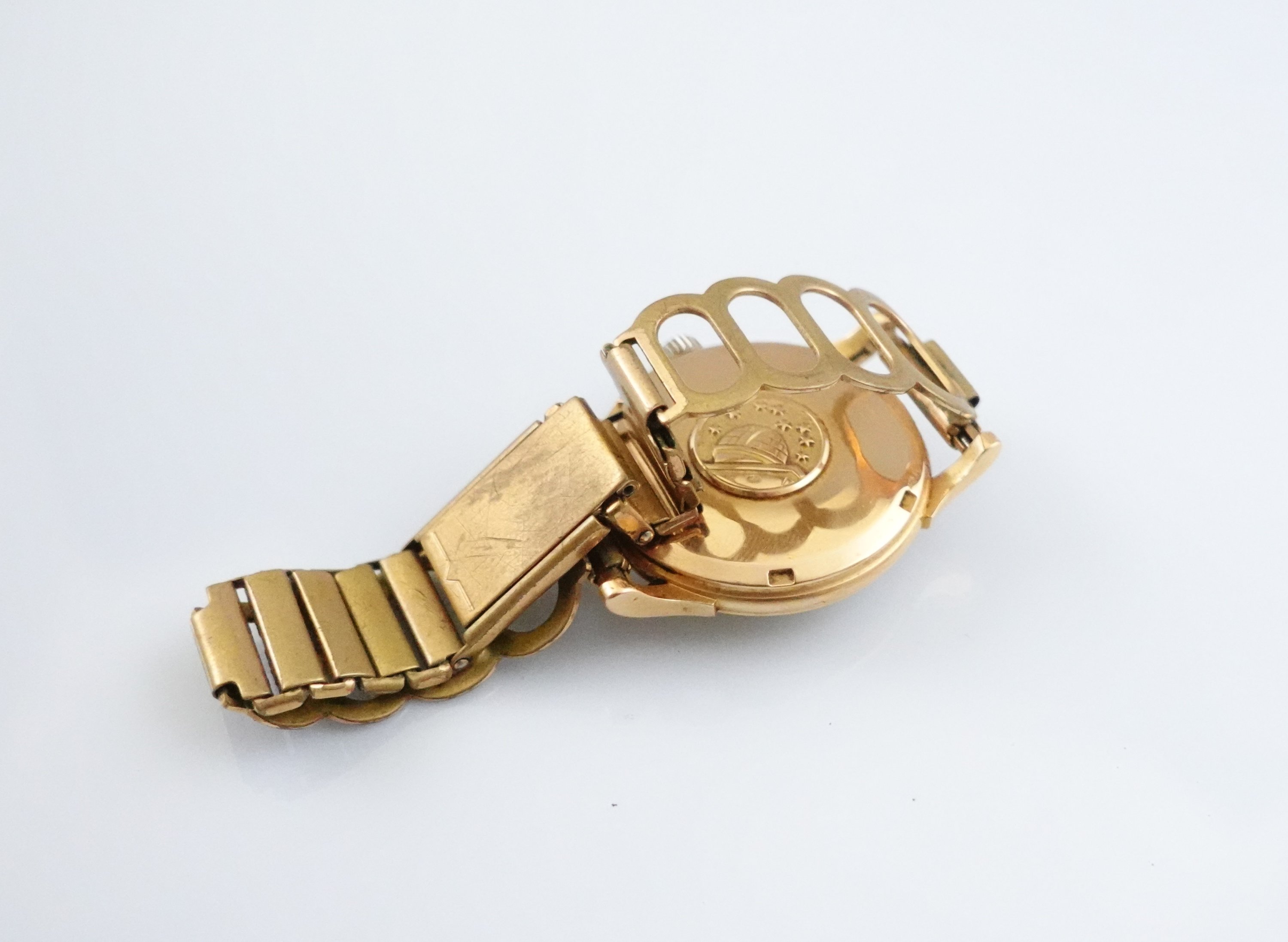 en or jaune 750 millièmes. Le cadran dit "Pie Pan" à fond argenté indiquant les heures par des index bâtonnets. Fond de boîte gravé de l'observatoire de Genève et huit étoiles. Mouvement à mécanique à remontage automatique.