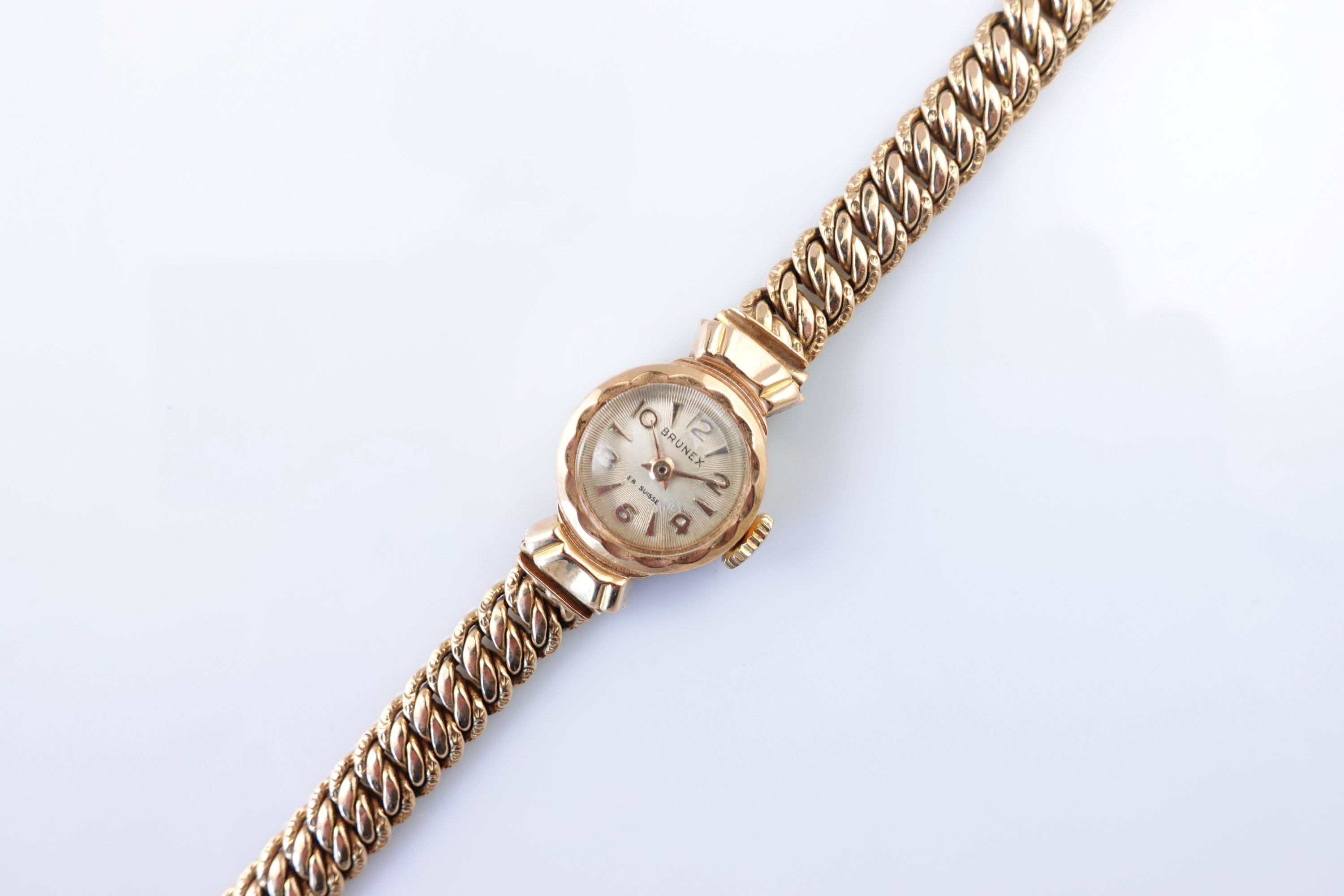 en or jaune 750 millièmes. Cadran guilloché signé "Brunex E.B. Suisse", fond du boîtier numéroté "2190". Bracelet à mailles américaines en or jaune 750 millièmes.